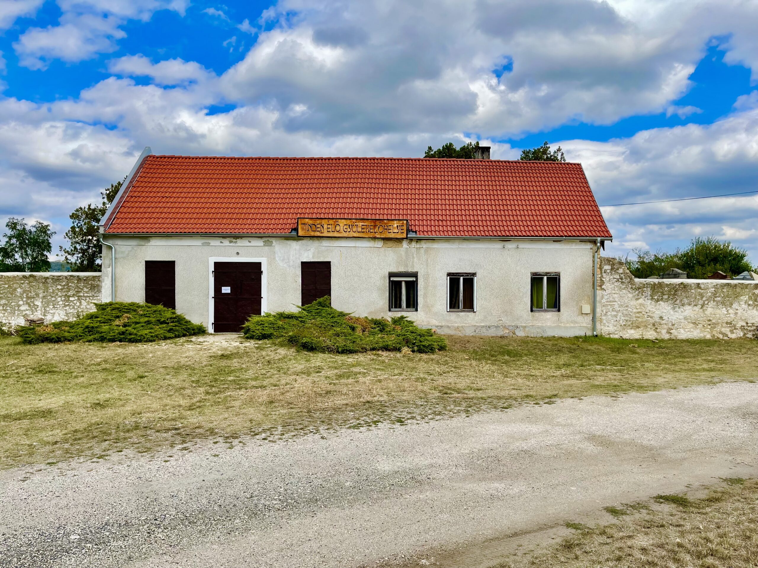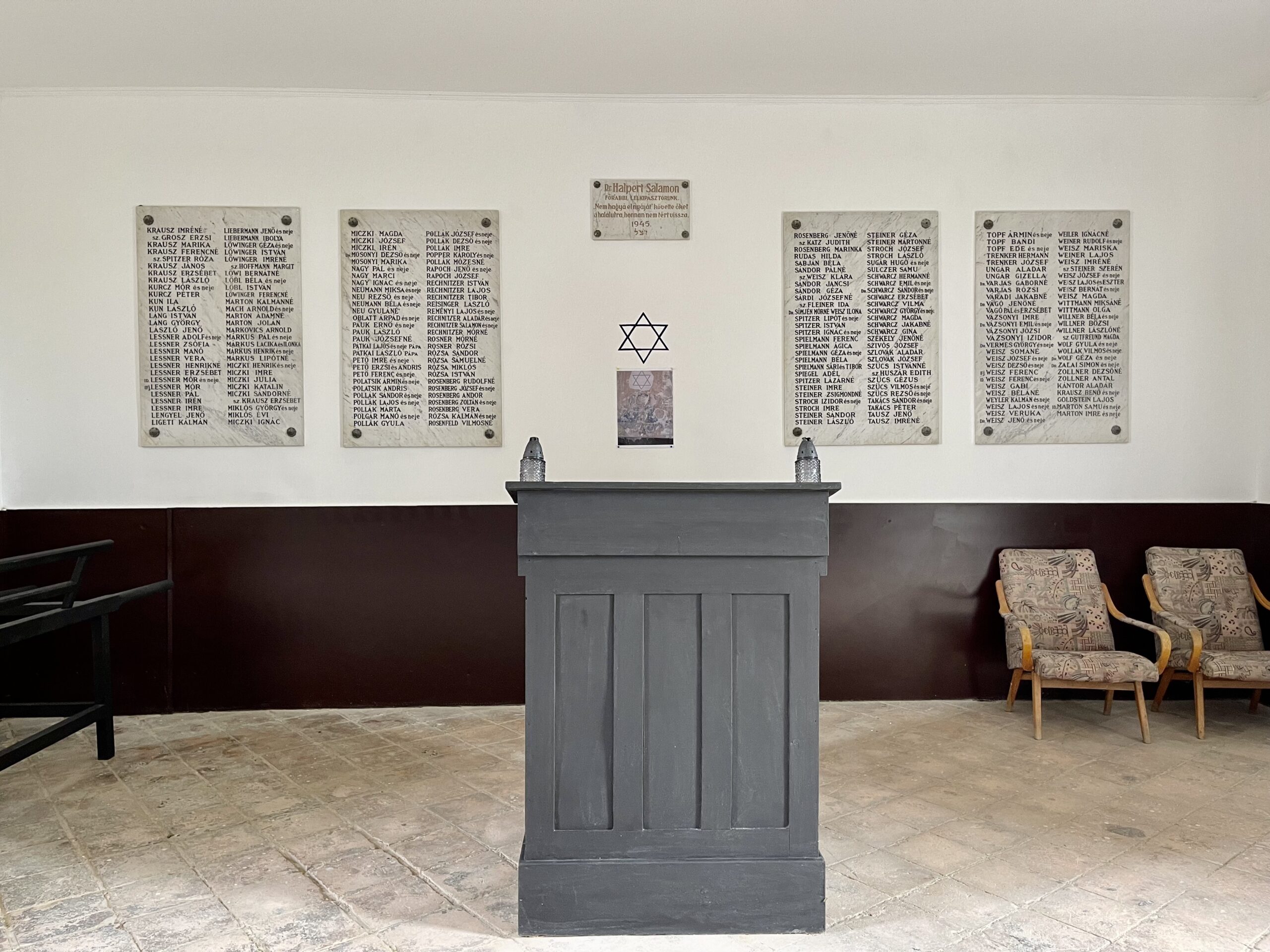 Az egyesület által szervezett délelőtti sétát lekéstük, de reméltem, hogy sikerül valahogy bejutni a sírkertbe, ahová a bejárat a ravatalozóházon keresztül vezet. Az épület jobb oldali szárnyában lakik a gondnok, akit nem is kellett hívni, magától jött, széles mosollyal az arcán, s nyitotta az ódon vaskapukat. A szertartási épület jó karban lévő, tetején a héber betűk alapján stilizált kiírással: „Minden élő gyülekezőhelye”. Bent egy régi félköríves pódium előtt irodaszékek sorakoznak, a falakon pedig négy-négy nagy márványtábla a mártírok neveivel, a további hat tábla az áldozatok hosszú sorának további kiegészítései.