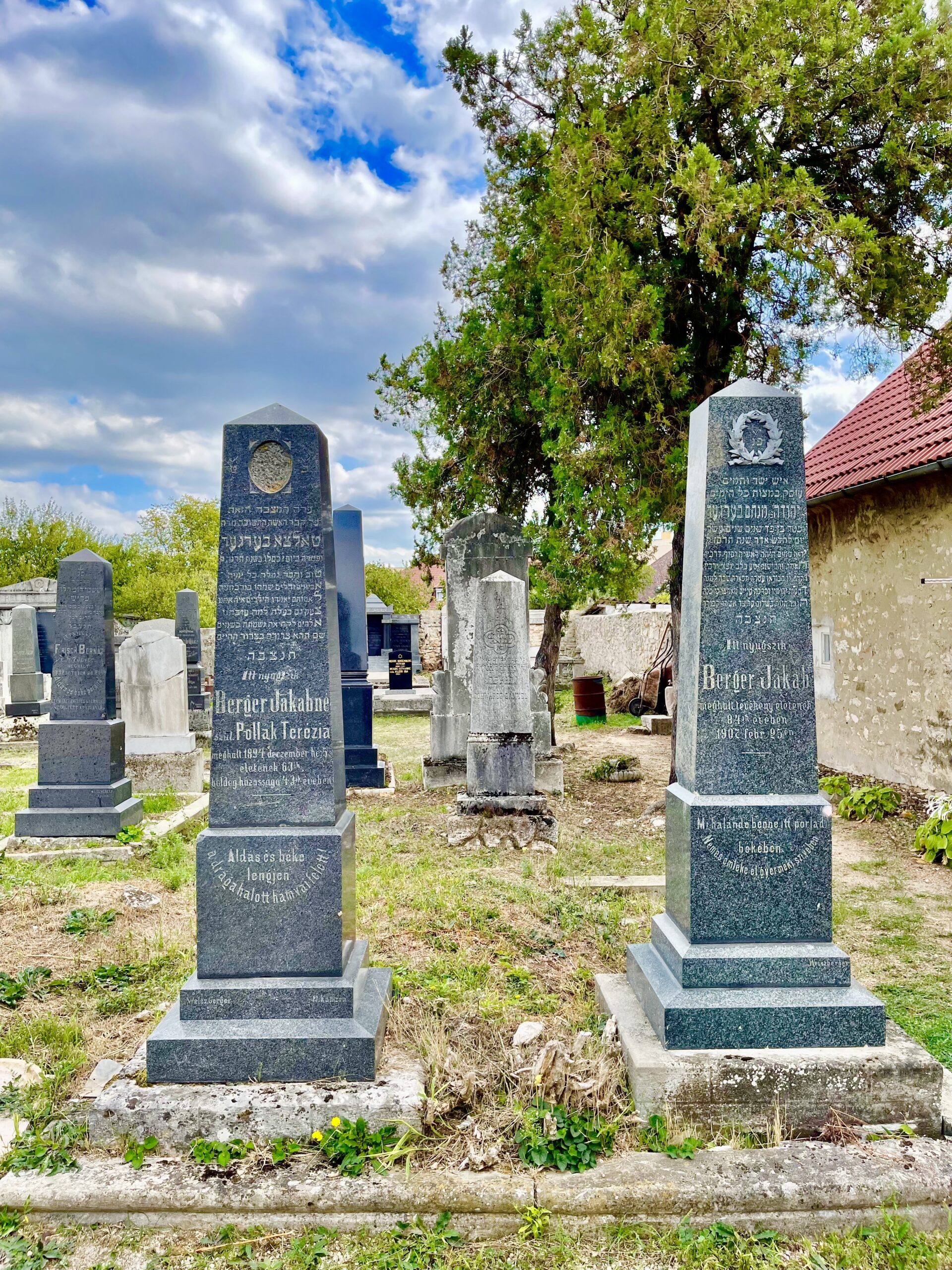Jobbra Berger Jakab (1825–1907) és felesége, született Pollák Terézia (1831–1894) obeliszkje magasodik egymás mellett. Berger kereskedő volt, aki mint a környéken oly sokan, idővel a borra szakosodott, melynek alapját a badacsonyi oltványszőlője biztosította. 1889-ben egyik alapító tagja volt a Balaton-melléki Takarékpénztár Rt.-nek is. Feleségével négy fiuk volt, azonban sírja csak egyiküknek, Berger Manónak (1863–1939) áll a temetőben. B. Manó apja nyomdokaiba lépett, s az egyik legnagyobb borexportőr lett, emellett a tapolcai társadalom egyik olyan virilise volt, aki sosem mulasztott el az élen járni a jótékonyságban sem. A négy fiú közül ő volt a legszerencsésebb, de nem feltétlenül a karrier miatt, hanem, mert „még időben meghalt”; sokat szenvedett ő is a ’20-as évektől egyre erősödő antiszemitizmustól, de legalább a deportálásokat nem kellett elszenvednie, mint a közösség nagy részéhez hasonlóan a testvéreinek, Berger Vilmosnak (1860–1944), dr. Berger Sándornak (1868–1945), Berger Károlynak (1878–1944) és családjaiknak. B. Vilmos szintén borászattal foglalkozott, egyik vezetője volt a Badacsonyvidéki Szőlősgazdák Szövetkezetének. Mint virilista sokat fektetett a város villamosításába, 1919-ben pedig 10 ezer koronás alapítványt hozott létre a tapolcai hadiárvák megsegítésére. B. Sándor értelmiségi pályára ment, ügyvéd lett, akit 1902-ben a Tapolczai Takarékpénztár ügyészévé választottak, több más vezető pozíció mellett pedig 1920-tól egészen a közösség lerombolásáig a hitközség elnöki posztját is betöltötte.