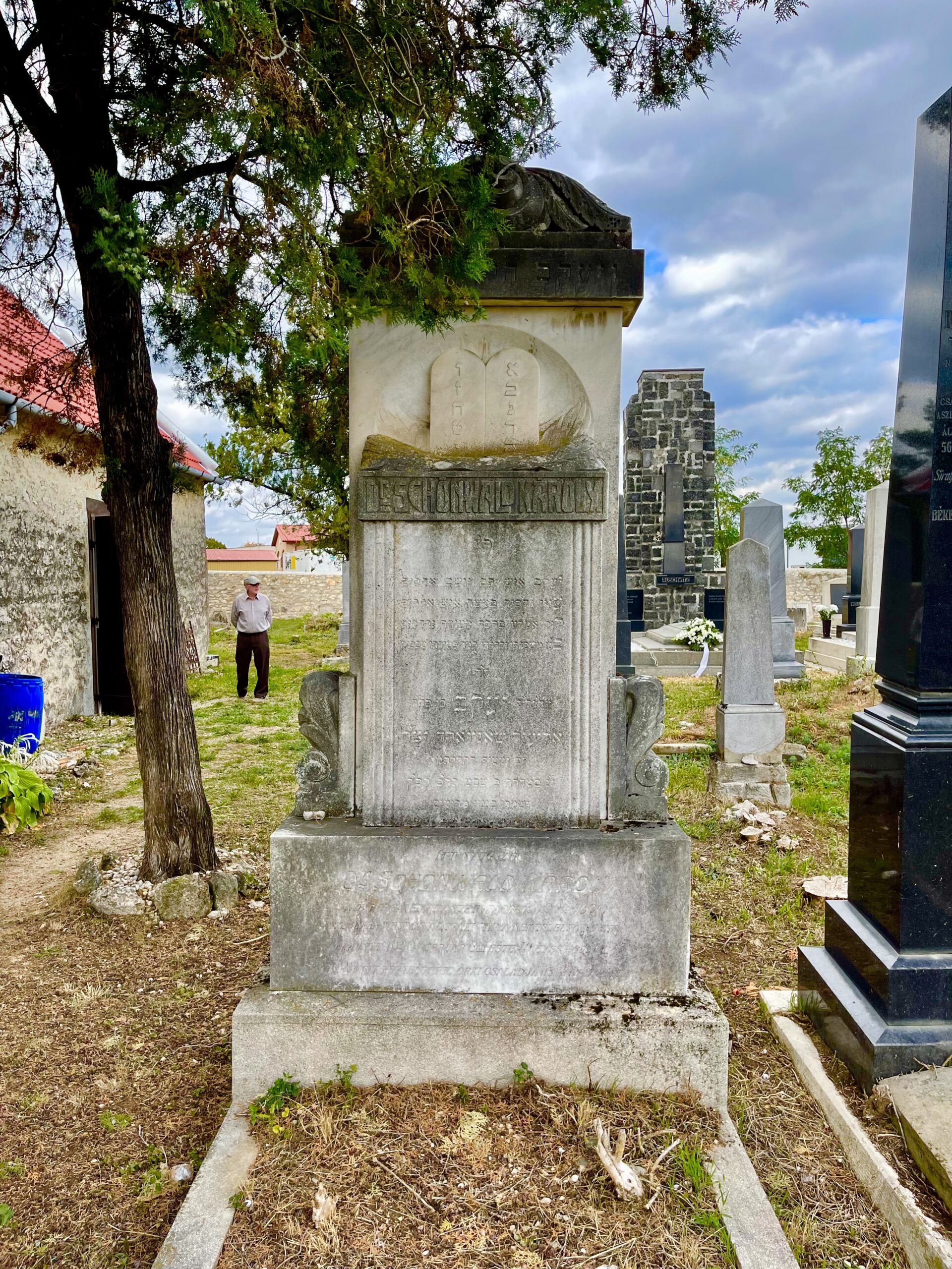 Szintén a bejárattól jobbra, egy öreg tuja árnyékában áll a hitközség tragikusan korán elhunyt főrabbijának, dr. Schönwald Károly (1879–1920/5680. svát 19.) sírja. A beszürkült kövön csak nehezen betűzhető a rabbi neve és héber nyelvű emlékverse, melyet úgy írtak meg, hogy a sorok első betűi kiadják az elhunyt héber nevét: Jákov. Az itt nyugvó foglalkozásáról árulkodik a törtfehér mózesi kőtábla, mely mintha csak egy felhőben lebegne a fakó sírvers felett. Schönwald rabbi 1904-ben, a Rabbiképző Intézetben történt felavatása után kertült a tapolcai rabbiszékbe, ahonnét a tomboló spanyolnátha ragadta el; három teljesen kis árvát hagyva maga után, miután felesége, Goldberger Berta már korábban meghalt.