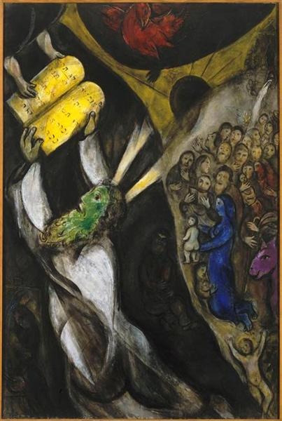 A hágádák után vessünk egy pillantást Marc Chagall művészetére. A világhírű festő a fehéroroszországi Vityebszk melletti Lioznában született 1887-ben. Vityebszkben egykor népes zsidó közösség élt és virágzott. A város egyik zsinagógáját látogatta a kilencgyermekes Szegál család, köztük Mose, a későbbi Marc Chagall, akinek színes, zsidó szimbólumokban gazdag művein gyakran feltűnnek a zsidó motívumok, zsidó személyek, zsinagógák, rabbik, angyalok. Hosszú és rendkívül termékeny élete során számos alkalommal festette meg a tóraadást, az alábbiakban néhány példát mutatunk.