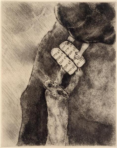 A klasszikus, ívelt tetejű kőtáblákat a michelangelói hagyományokat követő, szarvakkal övezett Mózes veszi át. Mögötte többnyire ott látható a csak néhány vonallal felvázolt nép, esetleg gyertyatartó, aranyborjú, a megváltás előhírnökeként érkező kakas, angyalok vagy más, mély szimbolikus tartalmat hordozó elemek.
