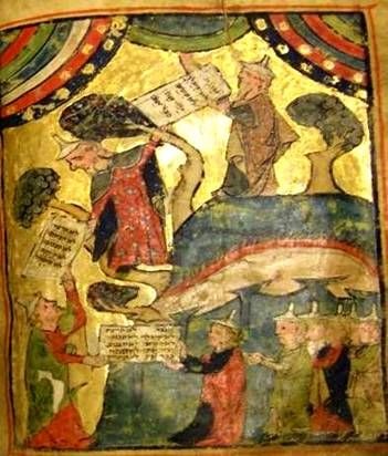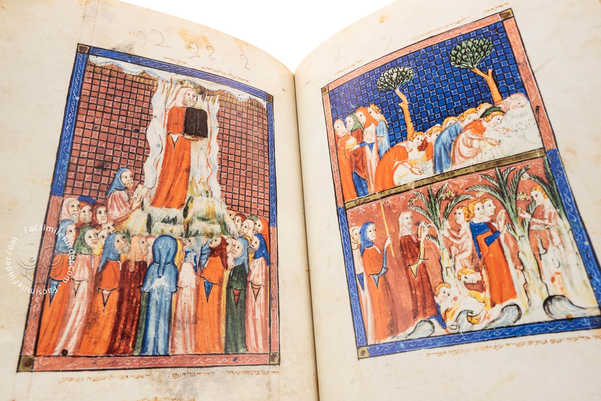 A háromrészes máchzornak nevezett illusztrált ünnepi imakönyv körülbelül a Madárfejű hágádával egyszerre keletkezett, szintén Dél-Németországban, ám gazdag, vörösben, kékben, zöldben és aranyban pompázó illusztrációi egészen más megrendelői körről, illetve illusztrátorról árulkodnak. Mózes harsonazúgás közepette veszi át a kőtáblákat, a nép élén Áronnal, a főpappal (akit tiarára emlékeztető süvege és mérete is megkülönböztet a többi szemlélőtől) áhítattal figyeli. További érdekesség, hogy a képen nők is megjelennek – természetesen a férfiaktól elkülönülő csoportban – és nekik, nehogy az imádkozónak a szépségükkel elvonják a figyelmét –, madártól vagy más állattól (talán bárány) kölcsönzött fejük van. Témánktól egy picit eltérve még egy illusztrációt láthatnak a háromrészes máchzorból. Ez a ritkán ábrázolt jelenet az ómeráldozat bemutatására készülő zsidókat mutatja be. A Tóra meghatározza az első termés learatásának menetét. Ezen a részletgazdag és színes illusztráción is látható, hogy egyes alakokat – többnyire nőket – állatfejjel jelenített meg a mester.