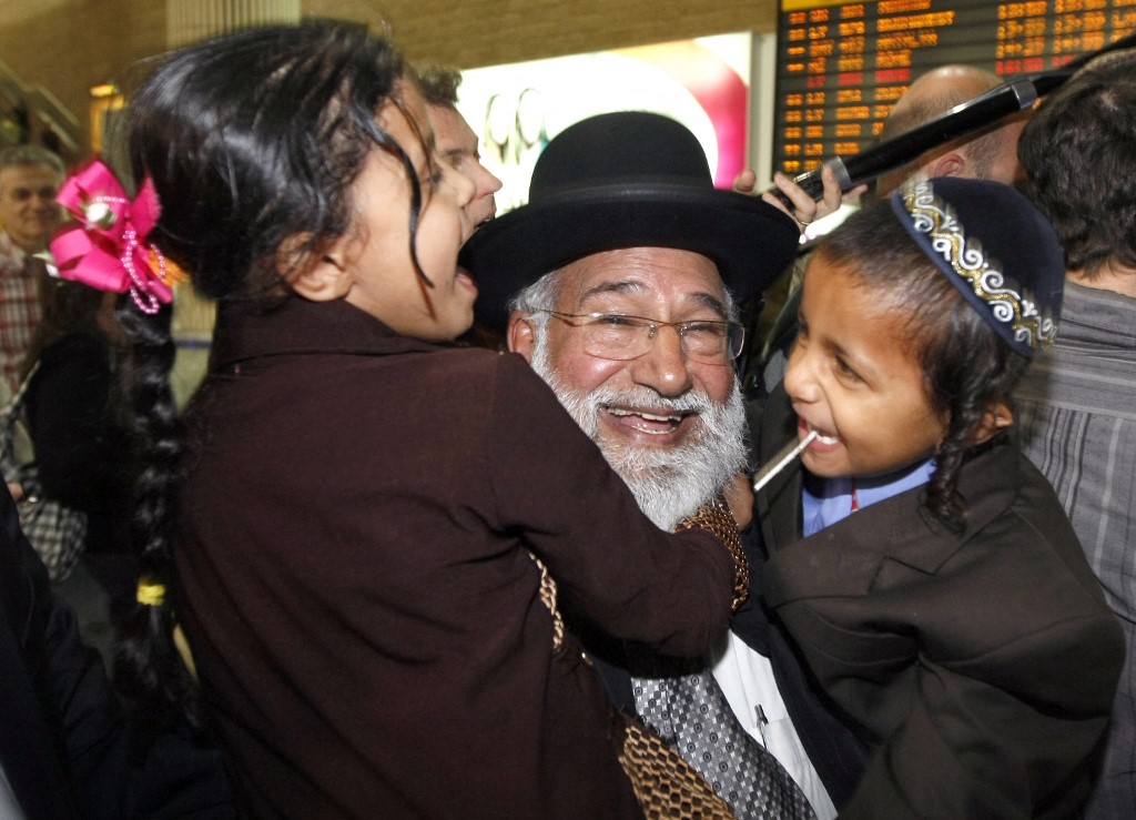 An Israeli Rabbi (C), with the Jewish Agency for Israel, greets two young members of a Yemeni Jewish family that arrived as new immigrants to Israel at Tel Aviv’s Ben Gurion airport, on February 19, 2009, after leaving their home country for fear of attack. Ten Yemeni Jews moved to Israel on February 19 after a murder and a series of attacks sparked fear among their small community. Among the new immigrants who landed at Ben Gurion international airport was Said Ben Yisrael, who heads the Jewish community in Raydah in Amran province, which is home to the majority of Yemeni Jews, a tiny population that totals around 400. AFP PHOTO/JACK GUEZ (Photo by JACK GUEZ / AFP)