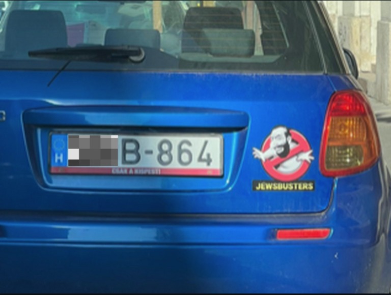 Az alapítványhoz juttatott fotót a budapesti forgalomban fotózták a hétvégén. Az autó rendszáma mellett közvetlenül egy Jewsbusters (zsidóirtók) autómatrica látható. A Ghostbusters (Szellemirtók) című 1984-ben bemutatott népszerű amerikai vígjáték plakátjáról ismert logóban a zsidó ember karikatúrája vehető ki.