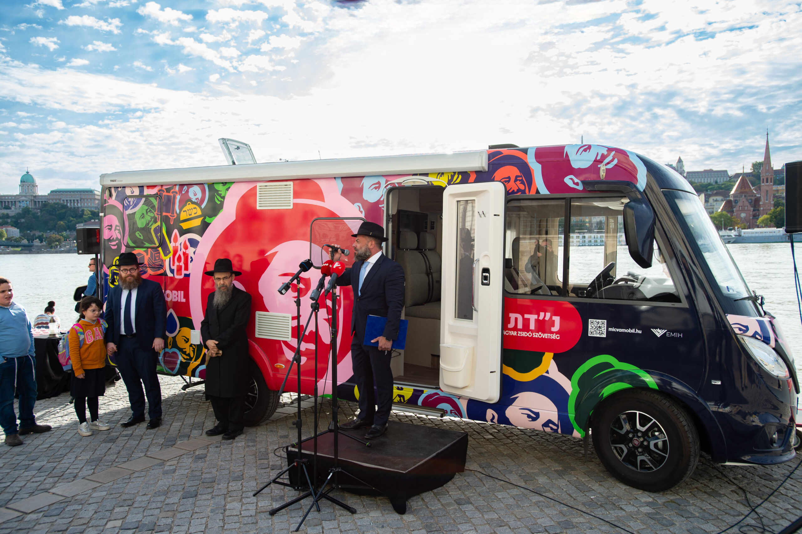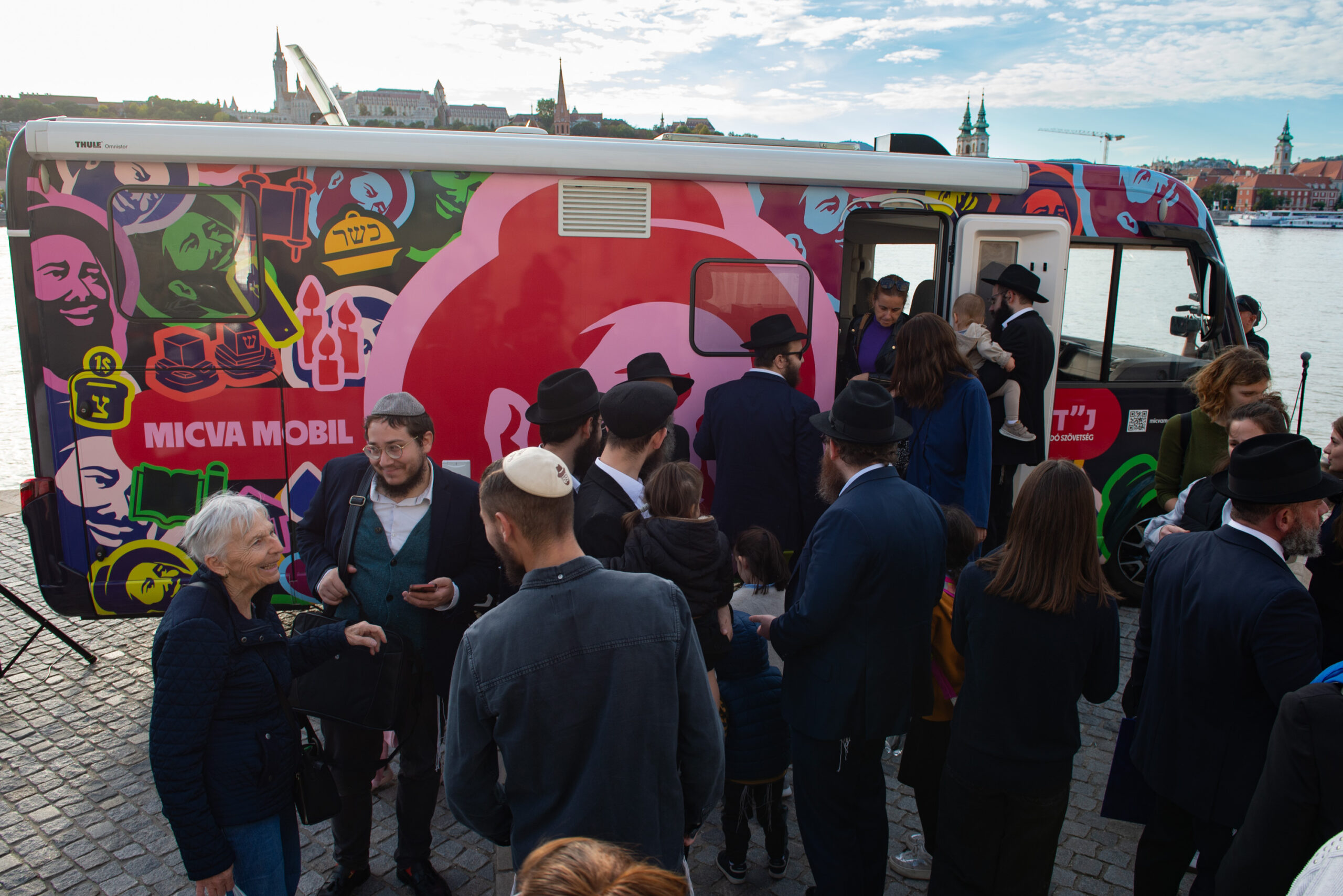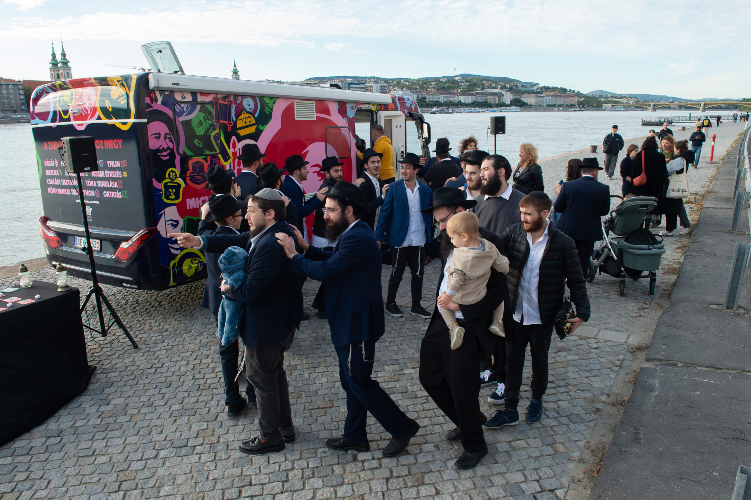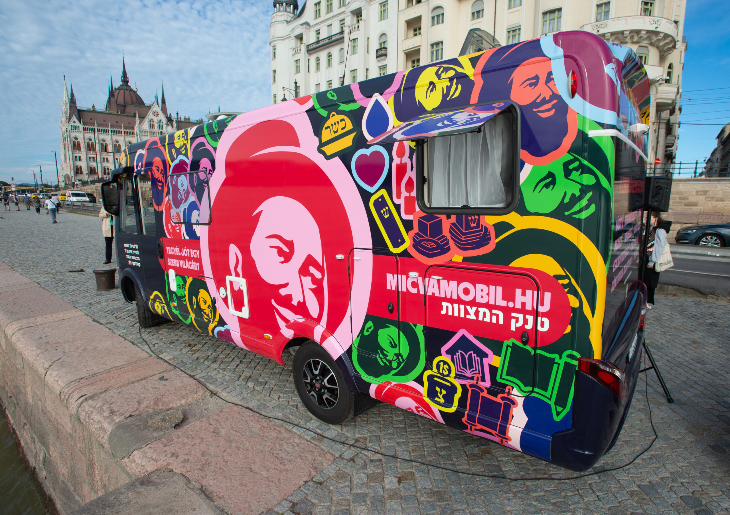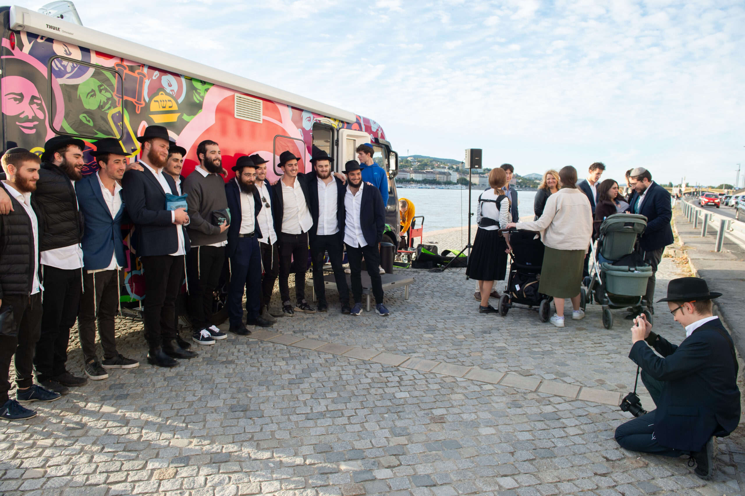 A szemfüles járókelők és turisták hétfőn már kora délután észrevehették, hogy valami készül a Duna-parton: egy feltűnően színes busz parkolt le a Cipők a Duna-parton emlékműnél, rajta Micva Mobil felirattal.