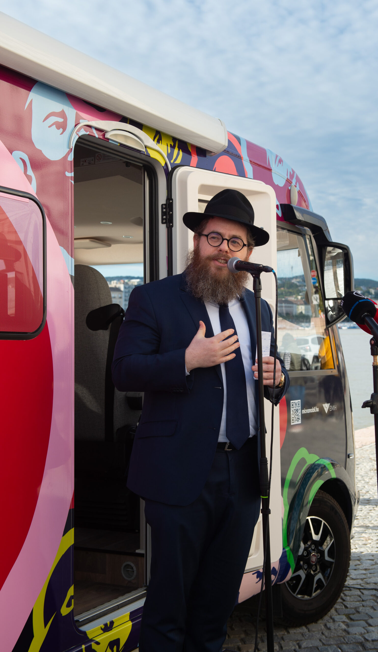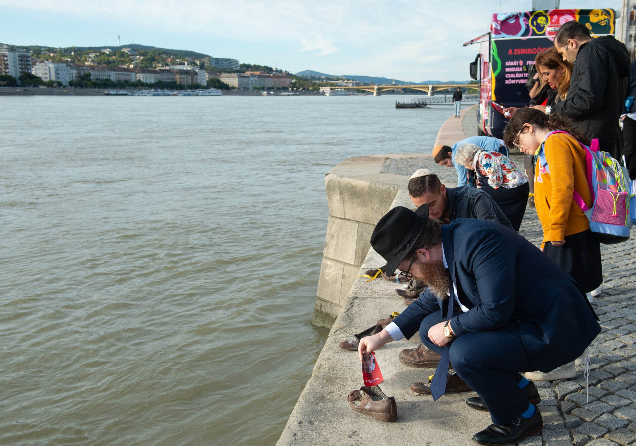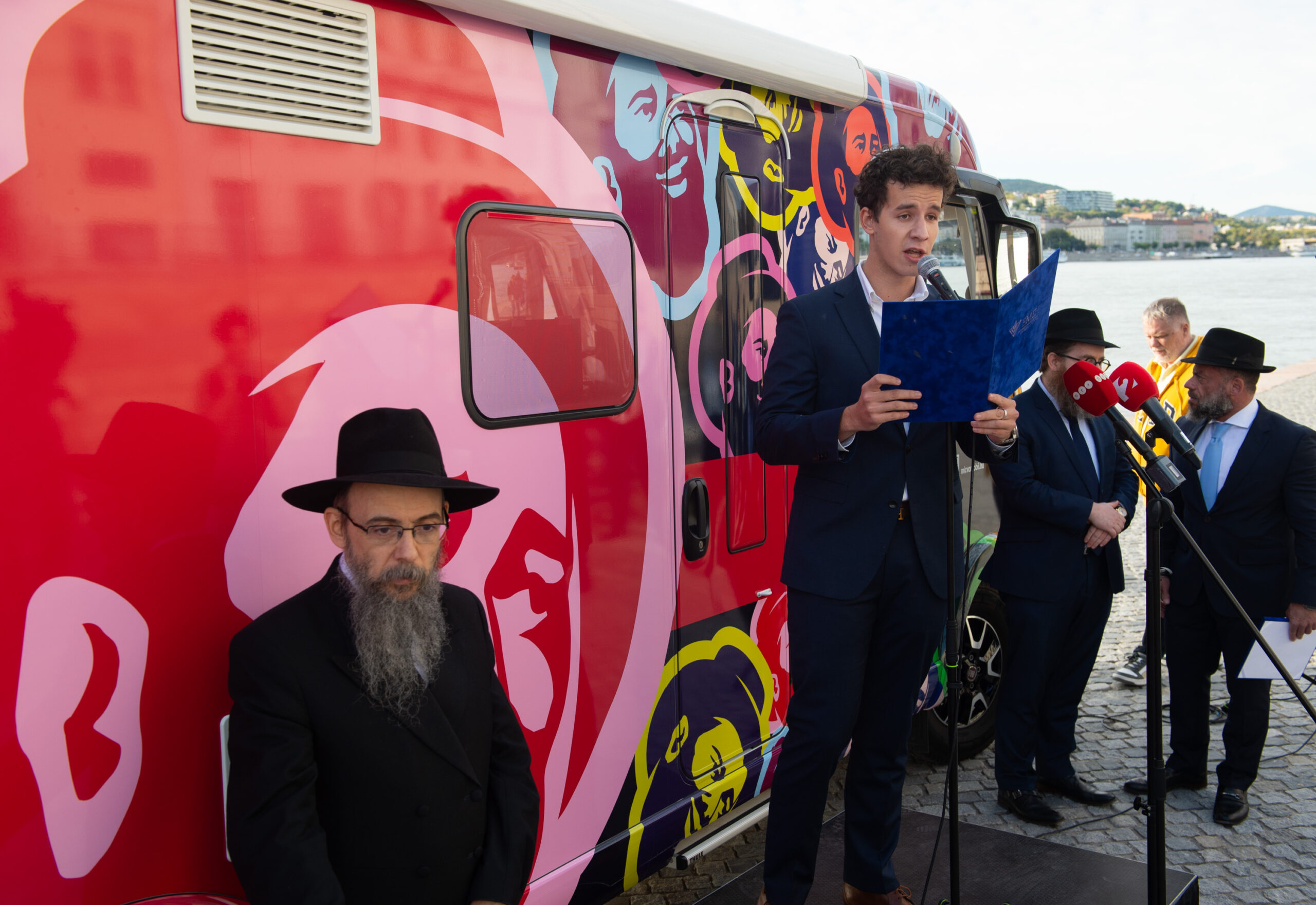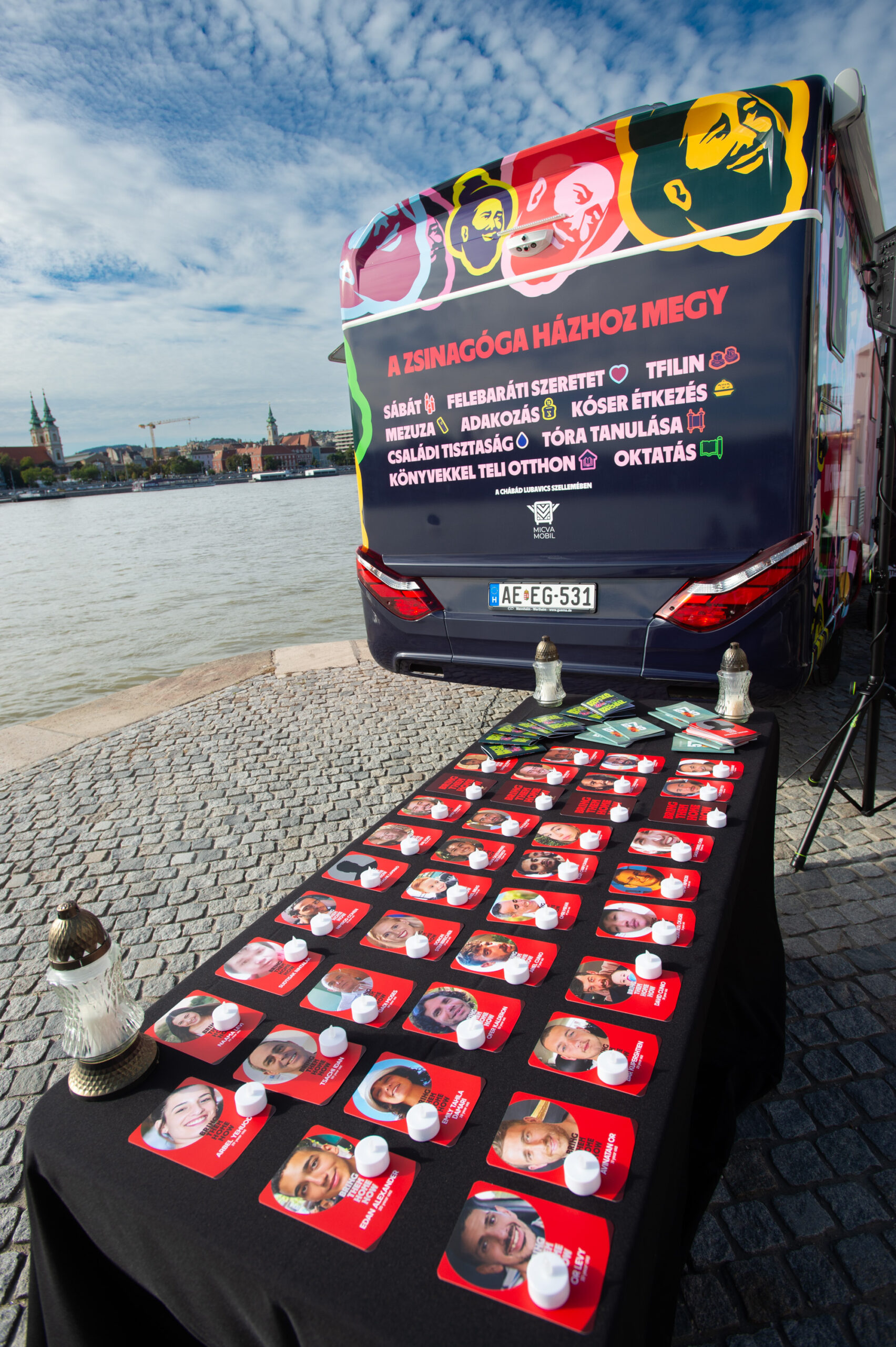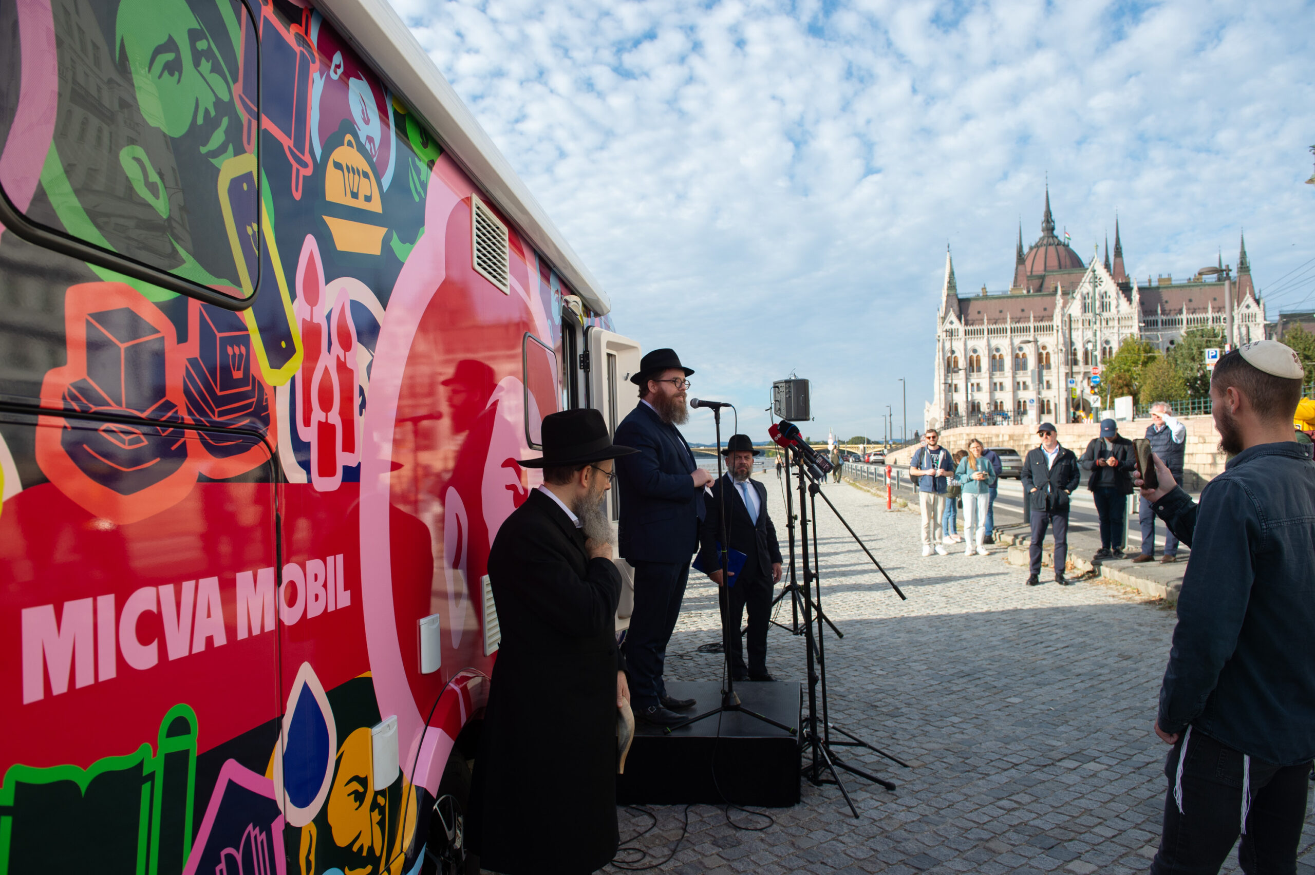 A szemfüles járókelők és turisták hétfőn már kora délután észrevehették, hogy valami készül a Duna-parton: egy feltűnően színes busz parkolt le a Cipők a Duna-parton emlékműnél, rajta Micva Mobil felirattal.