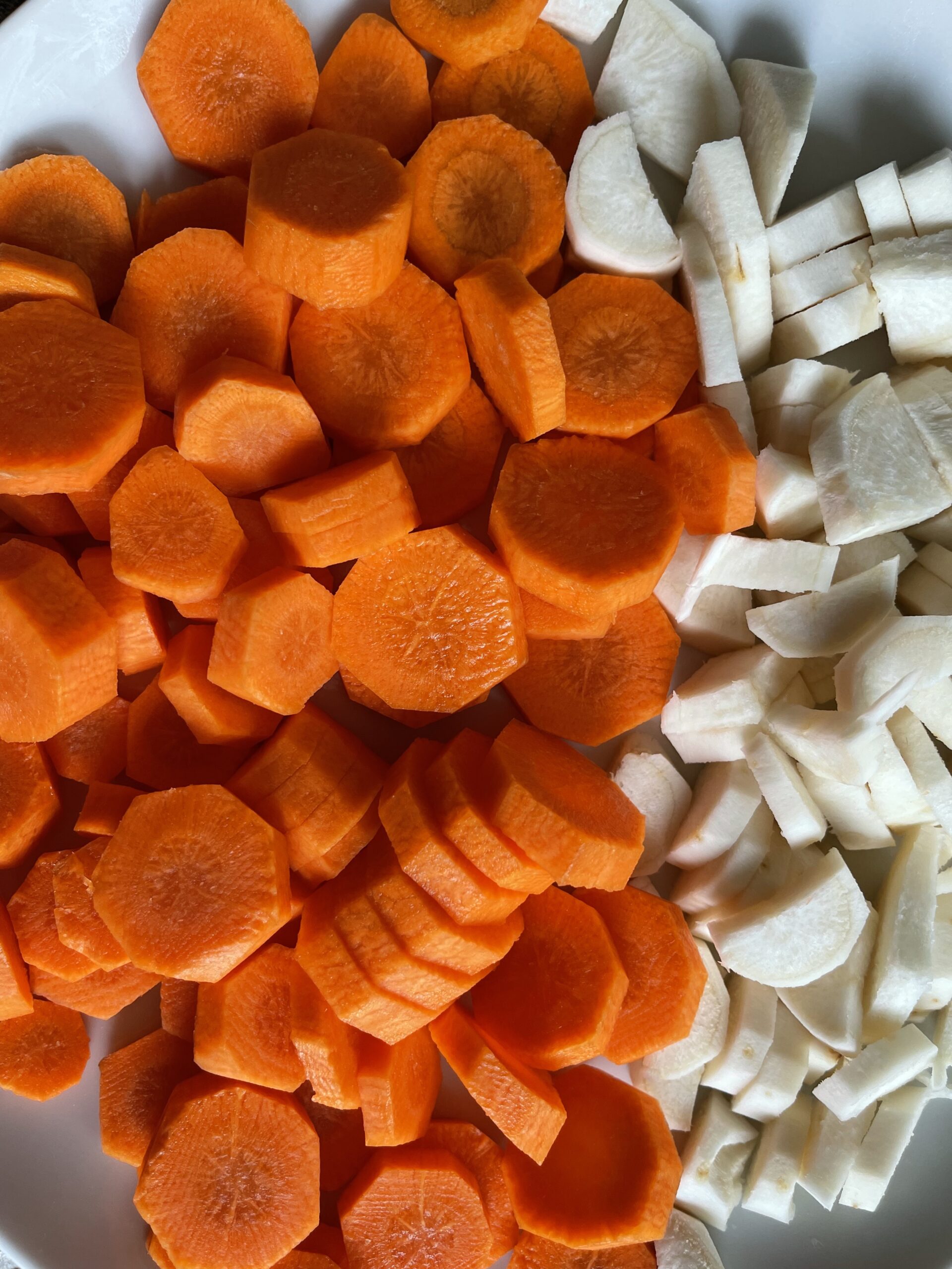 Ezekre jönnek az apróbbra vágott burgonya és zellergumó kockák, melyek majd lenyomják a zöldeket, hogy azok szintén omlósra főjenek majd. Utolsó rétegben pedig a répákat szoktam berakni. A hámozáshoz pedig krumplifejet használok, ami már eléggé veterán, szegényke évekkel ezelőtt a szeme világát is elveszítette, s így biztos szívesen nyugdíjazná is magát, de őszintén szólva nem találok megfelelően éles és stabil hámozót amivel helyettesíthetni tudnám, így marad ő.
