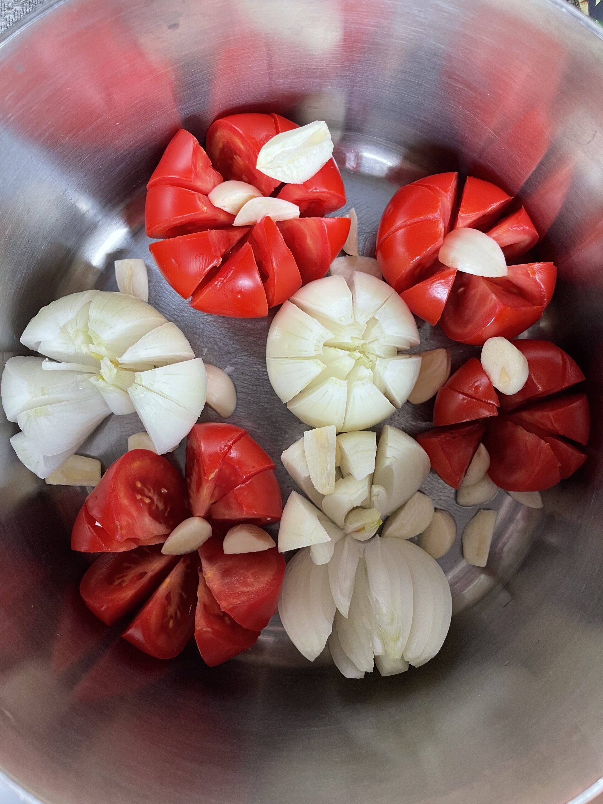 Először a paradicsomot szoktam felvágni, – ettől kellemesen édeskés lesz a leves. Mindig ki szoktam vágni a csumáját, mert gyerekkoromban azt mondták, hogy az mérgező, igaz, azt is mondták, hogy a kenyér héjában van a vitamin, és azt akkor ettől függetlenül nem ettem meg. De kicsit utánanéztem, és a paradicsom szárában valóban vannak mérgező alkaloidok, amiből a kapcsolódó zöld részbe átmehet valamennyi, meg egyébként is kemény, úgyhogy kivágom.