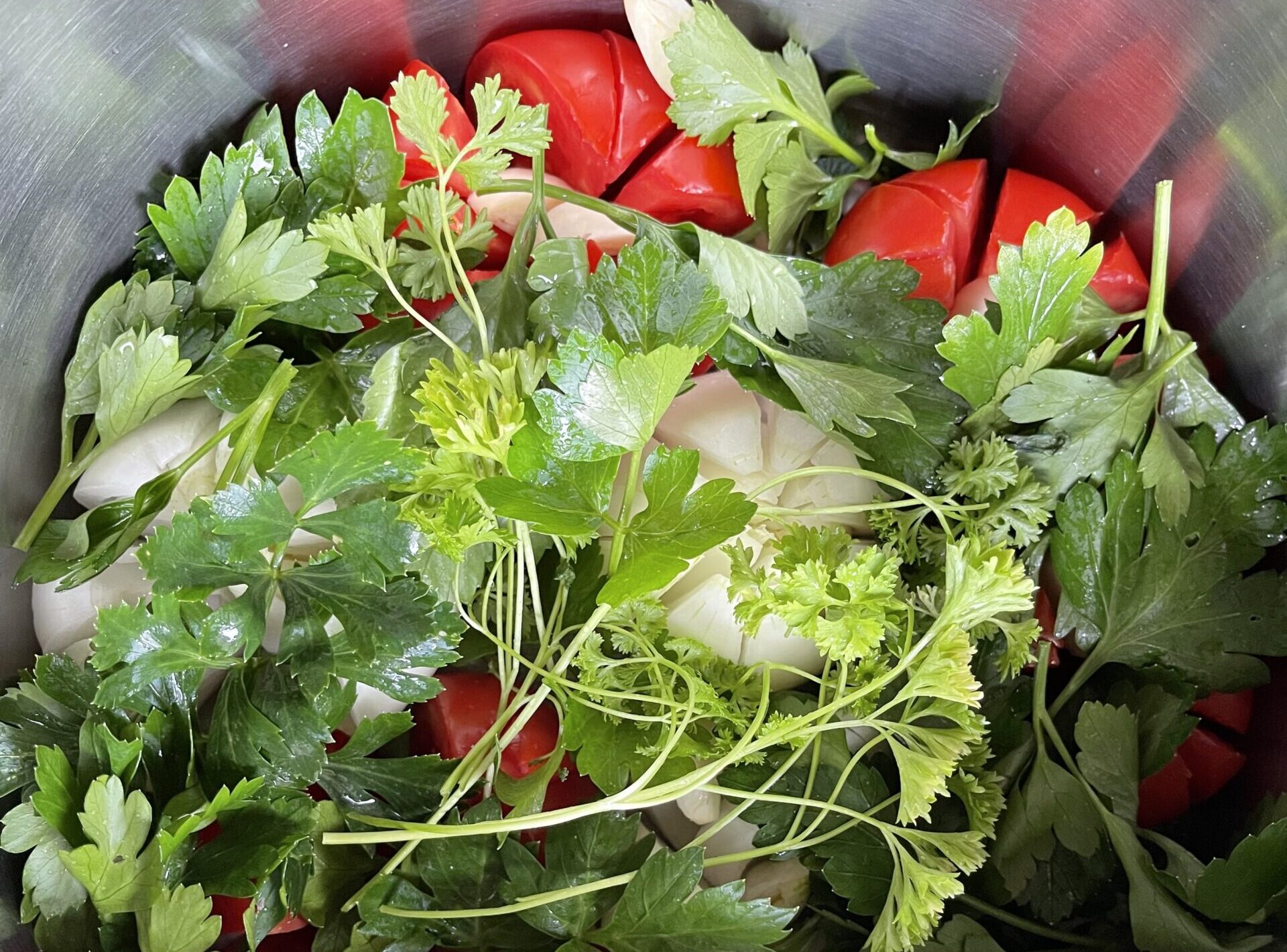 A felvágott paradicsomokat és hagymákat aztán megszórom a felharmadolt fokhagymaszeletekkel, amik majd puhára főnek, s majd mint a vaj olvadnak szét a szájban. Ezekre jönnek a zöldek, amiket én különösen szeretek, ha tavasz van, akkor egy csokor kaprot is szoktam beletenni. Ezeknél abban a szerencsés helyzetben vagyok, hogy még november végén, december elején is szedhetek a kertből, ráadásul a zellert olyan gumókból, amiknek a zöldjét már egyszer felhasználtam, csak aztán kigyökereztettem őket s azóta újból teremnek.