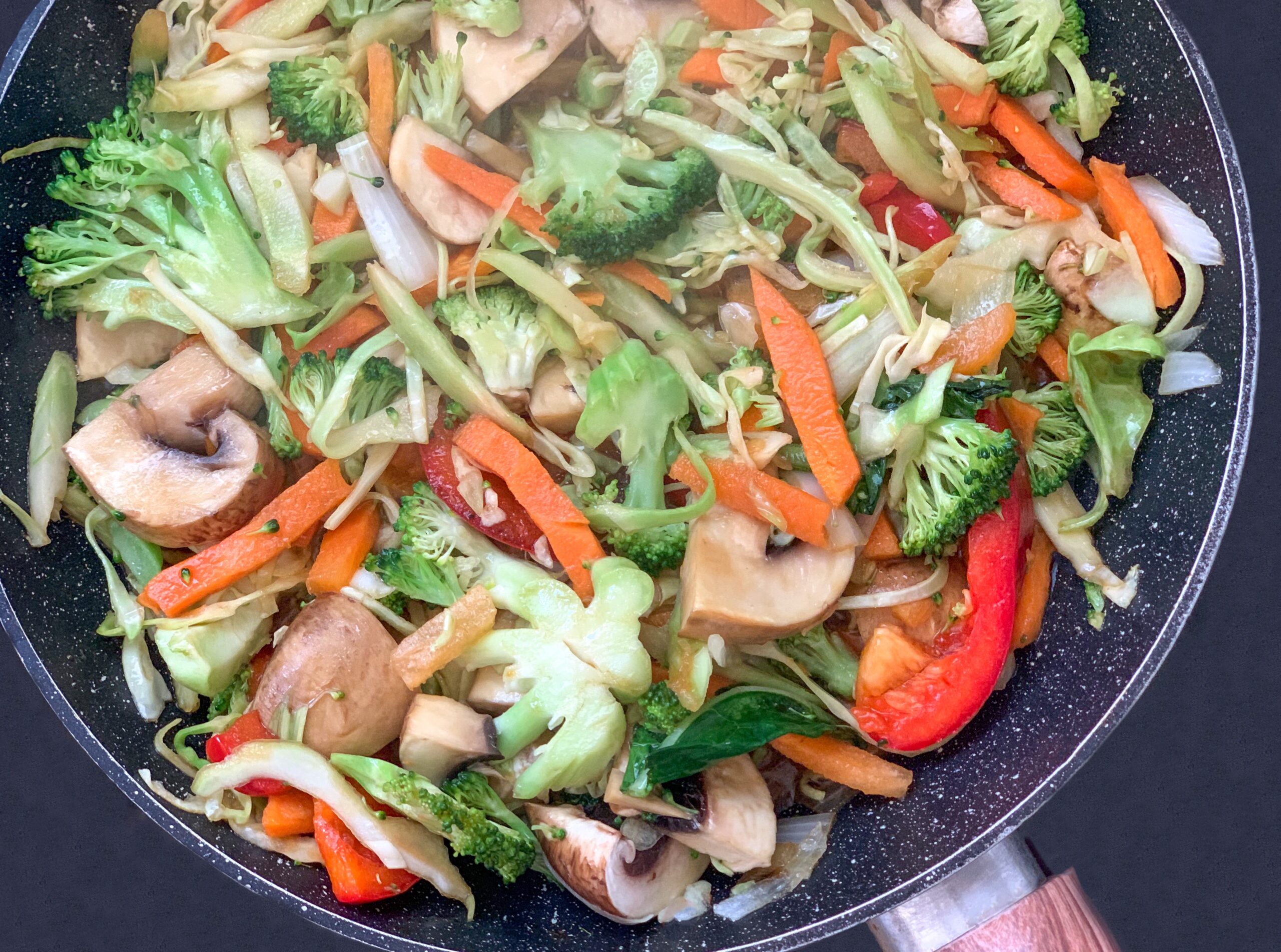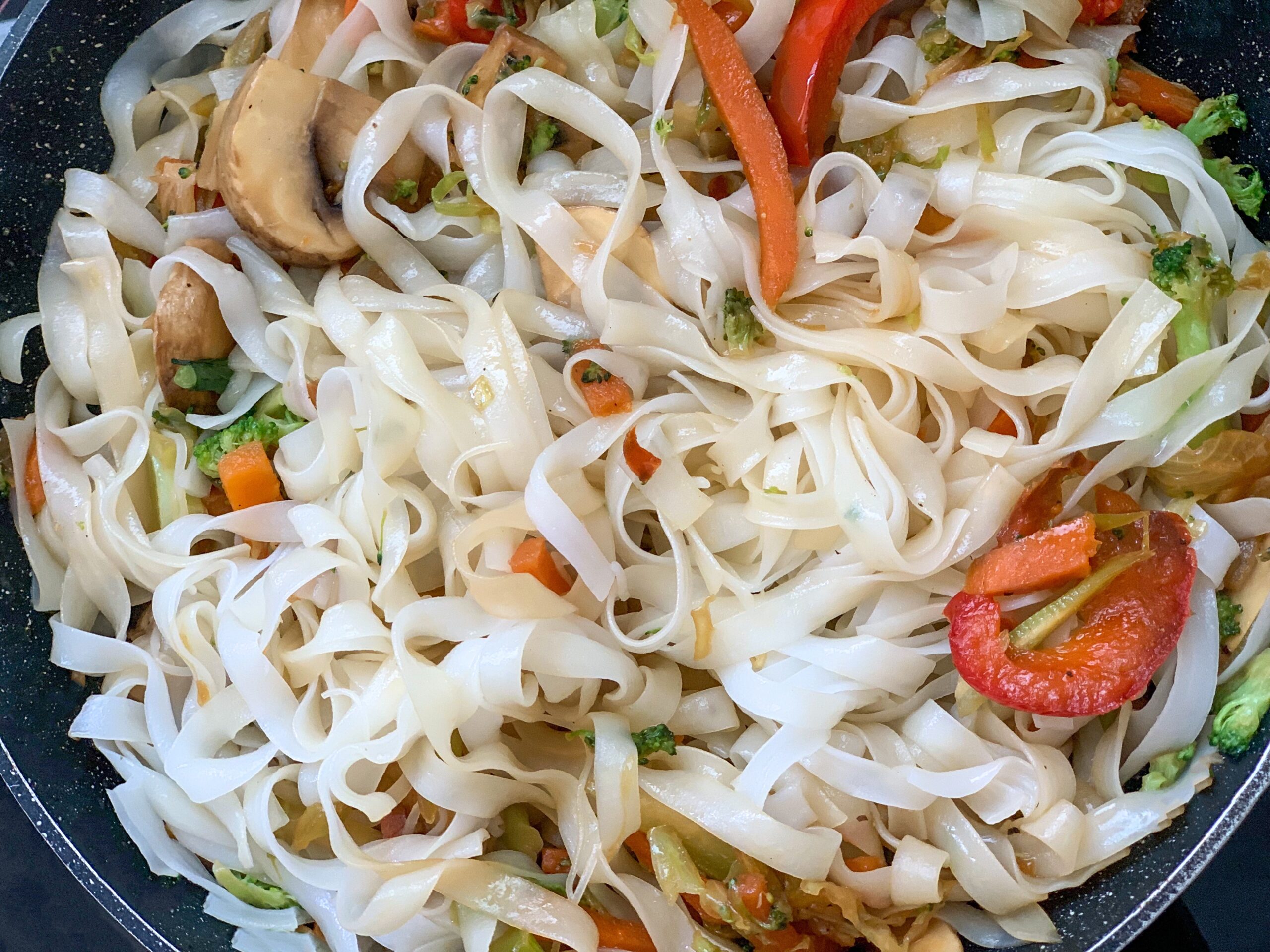 - Főzze közepes lángon amíg a zöldségek eléggé meg nem puhulnak, majd adja hozzá a kifőzött rizstésztát és pirítsa össze a serpenyő tartalmát.