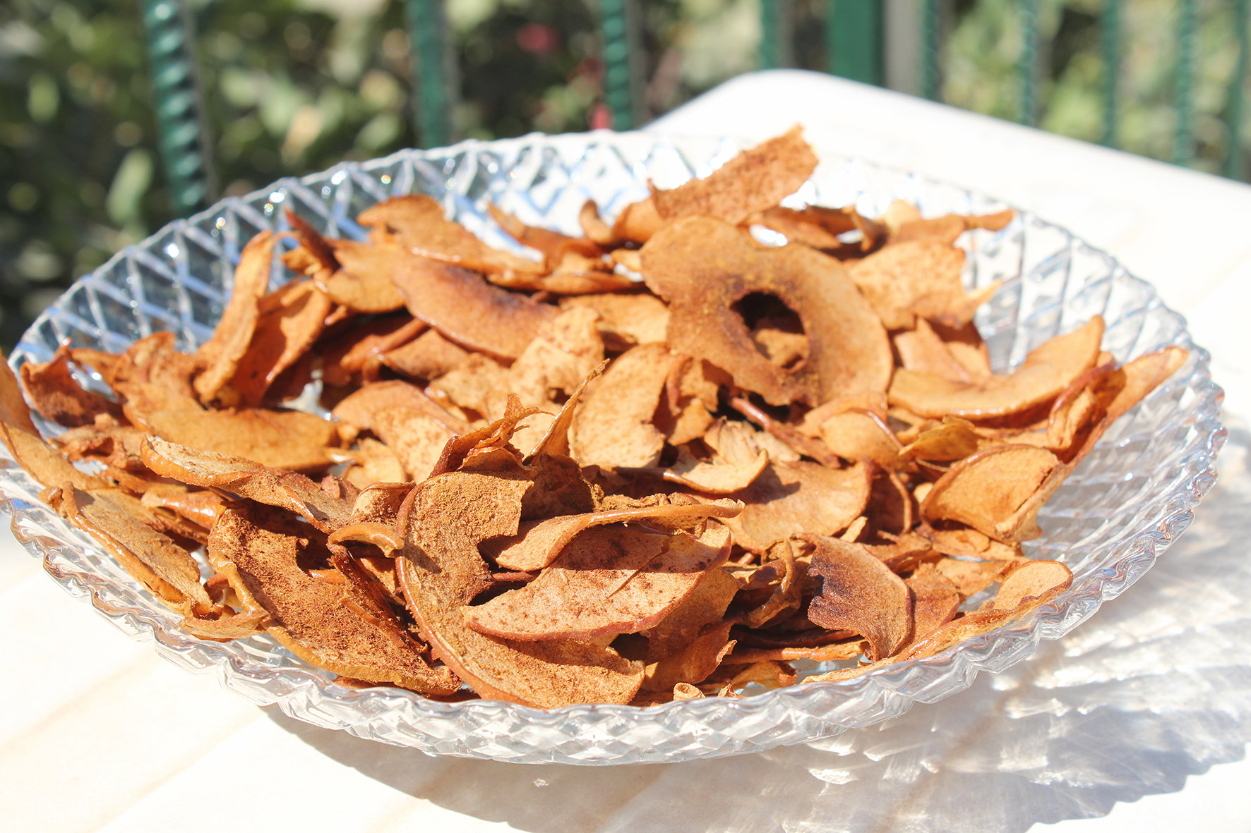 Néhány szem almát éles késsel nagyon vékony szeletekre vágunk (a héját nem kell lehámozni, de a magházát ki kell venni). Két sütőlemezt kibélelünk sütőpapírral, és az almaszeleteket úgy rendezzük el rajta, hogy ne fedjék egymást. Őrölt fahéjjal bőségesen megszórjuk (aki édesebben szereti, cukrot is szórhat rá, de az alma önmagában is kellőképpen édes). 120 fokon egy órán át sütjük, majd a sütőben hagyjuk kihűlni. Ha kihűlt, lezárt dobozban néhány napig eltartható.