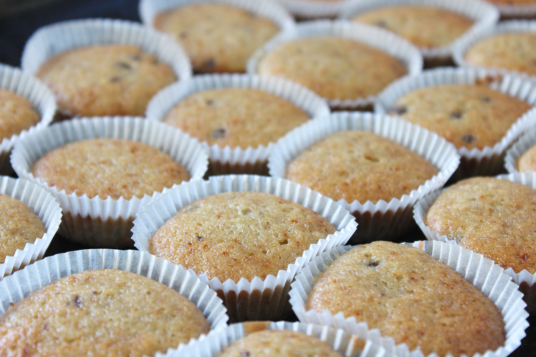 A tojásokat egyenként üvegpohárba ütjük és megvizsgáljuk, nehogy véresek legyenek. A tojásokat a cukorral és az olajjal kikeverjük. A banánokat botmixerrel simára pürésítjük. A lisztet tálba szitáljuk, hozzáadjuk a sütőport, a banánt és a tojásos keveréket. A csokoládét beleforgatjuk a masszába. Kisebb muffinformákba vagy papírformákba töltjük (egy-egy formát csak félig töltsünk meg a masszával), és mintegy 20 perc alatt, 180 fokos sütőben készre sütjük.
