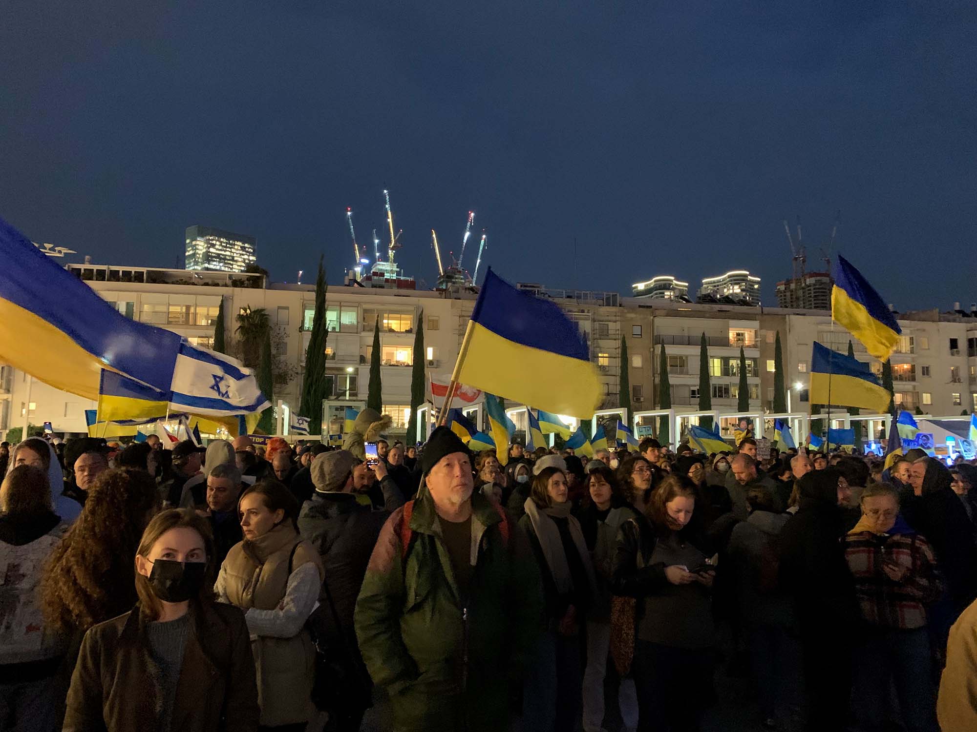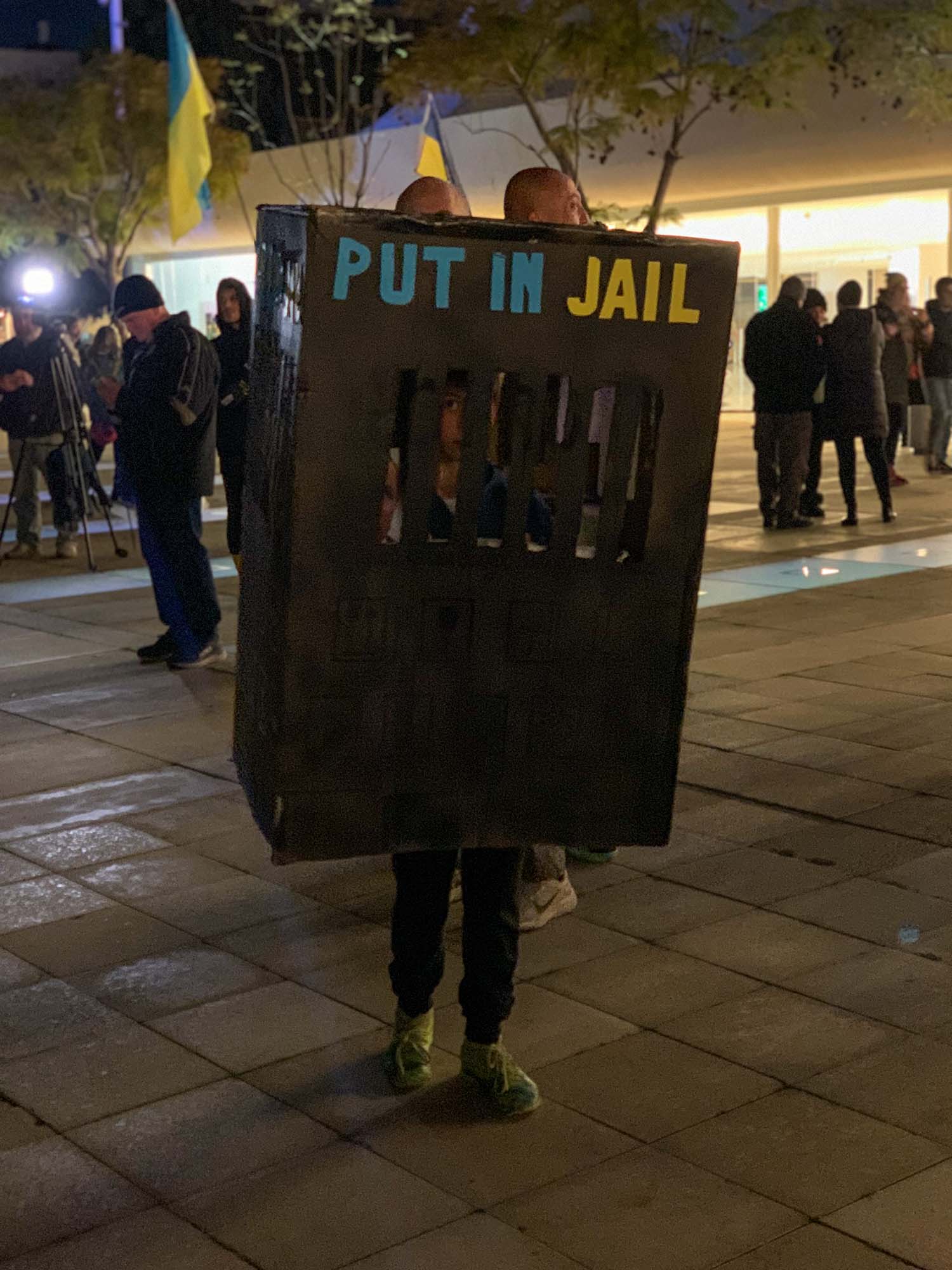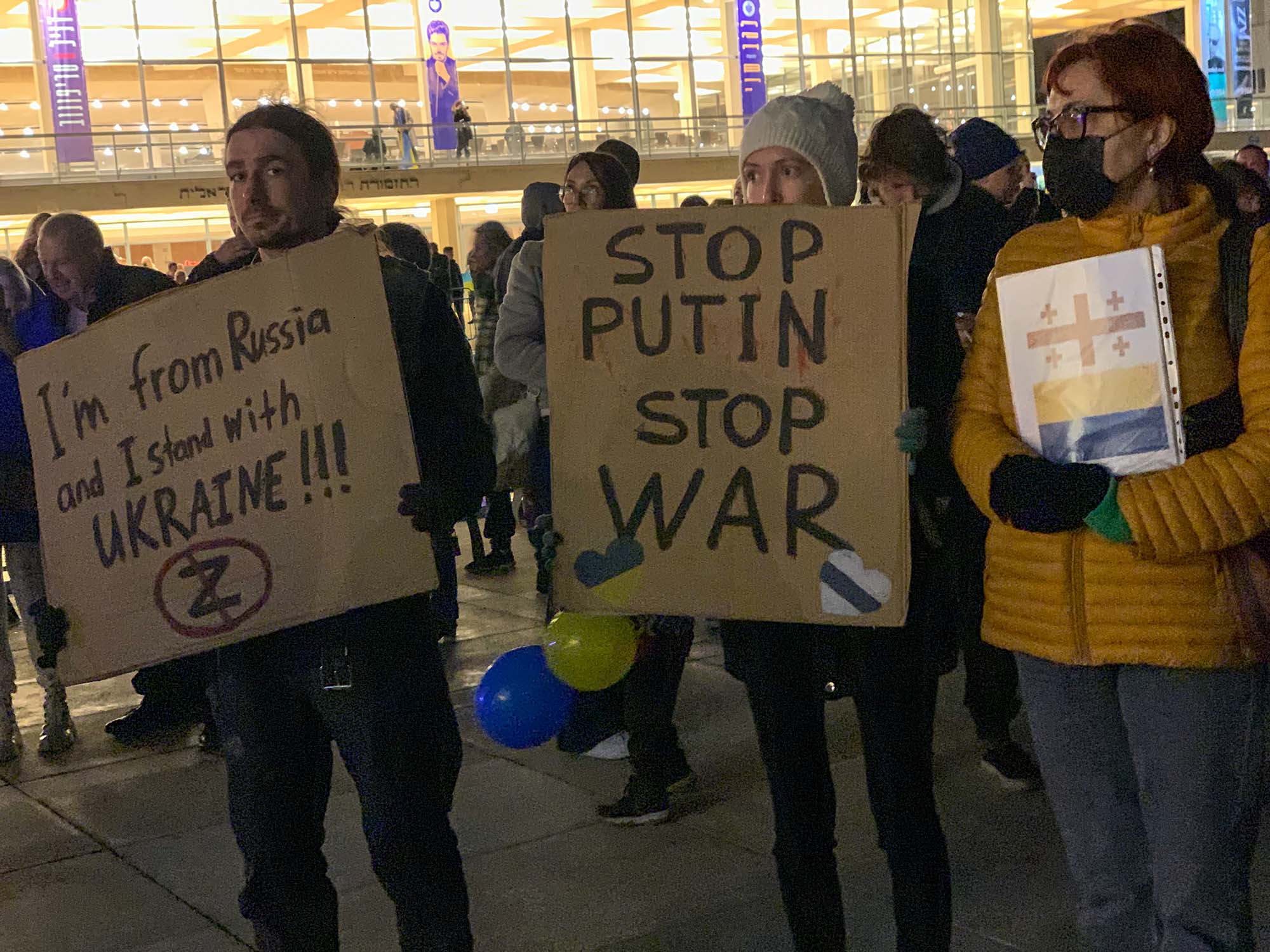 A téren több ezer ember gyűlt össze, volt, aki ukrán zászlót lobogtatott, aki táblával hirdette, hogy legyen vége a háborúnak és láttam olyat is, aki „Putin egy náci” feliratot festett papírjára. Olyan is akadt, aki purimi jelmezében érkezett, például a „Put in jail” feliratú mobilbörtönben. Az esemény kifejezetten békés volt, sok ukrán és orosz származású emberrel is találkoztam.