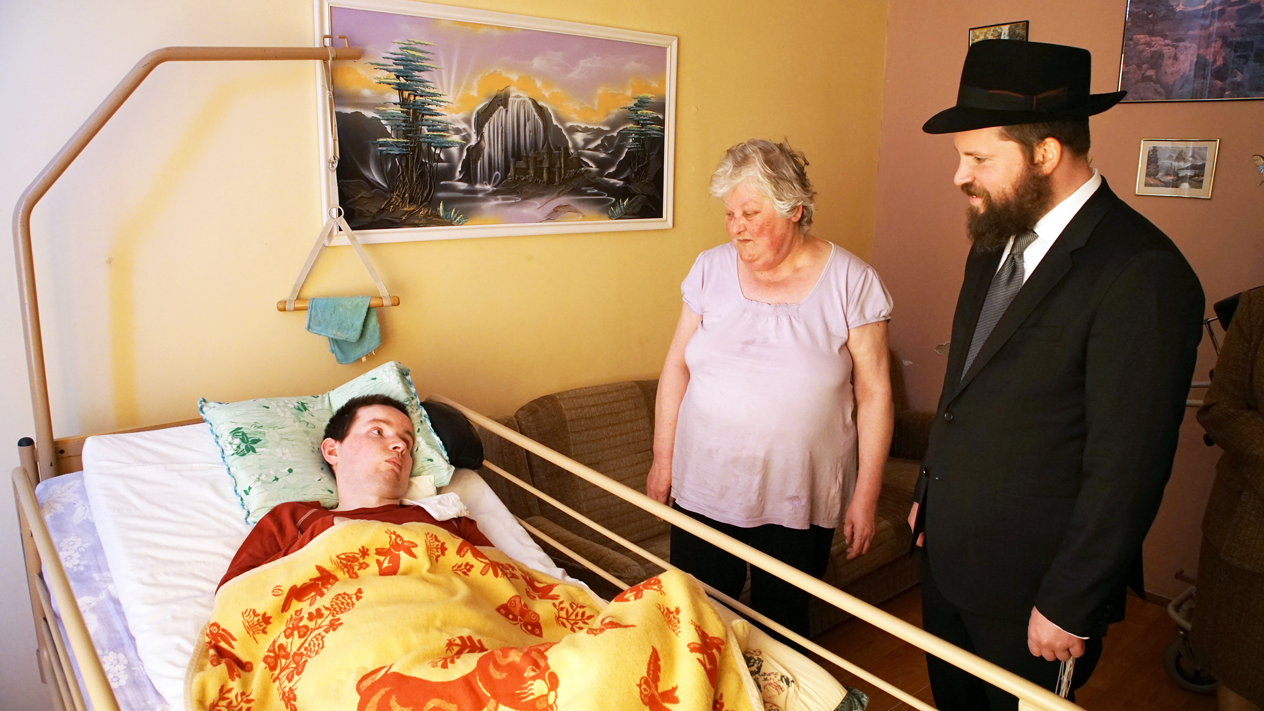 – Ebbe aztán belebetegedett az apja és az anyja is. Hihetetlen veszteség ez, nagyon értelmes fiú, sokra vihette volna – meséli a polgármester. Megállunk a kis ház előtt, a hatvan körüli édesanya a kapuban áll. Bekísér minket. Az utcafronti szobában egy nagy ágyon fekszik a fiú, nemrégiben töltette be a 33. életévét. Szilárdnak hívják. Élénk szeme folyamatosan cikázva követi, mi történik körülötte. Asher rabbi megáll az ágyánál, bemutatkozik.