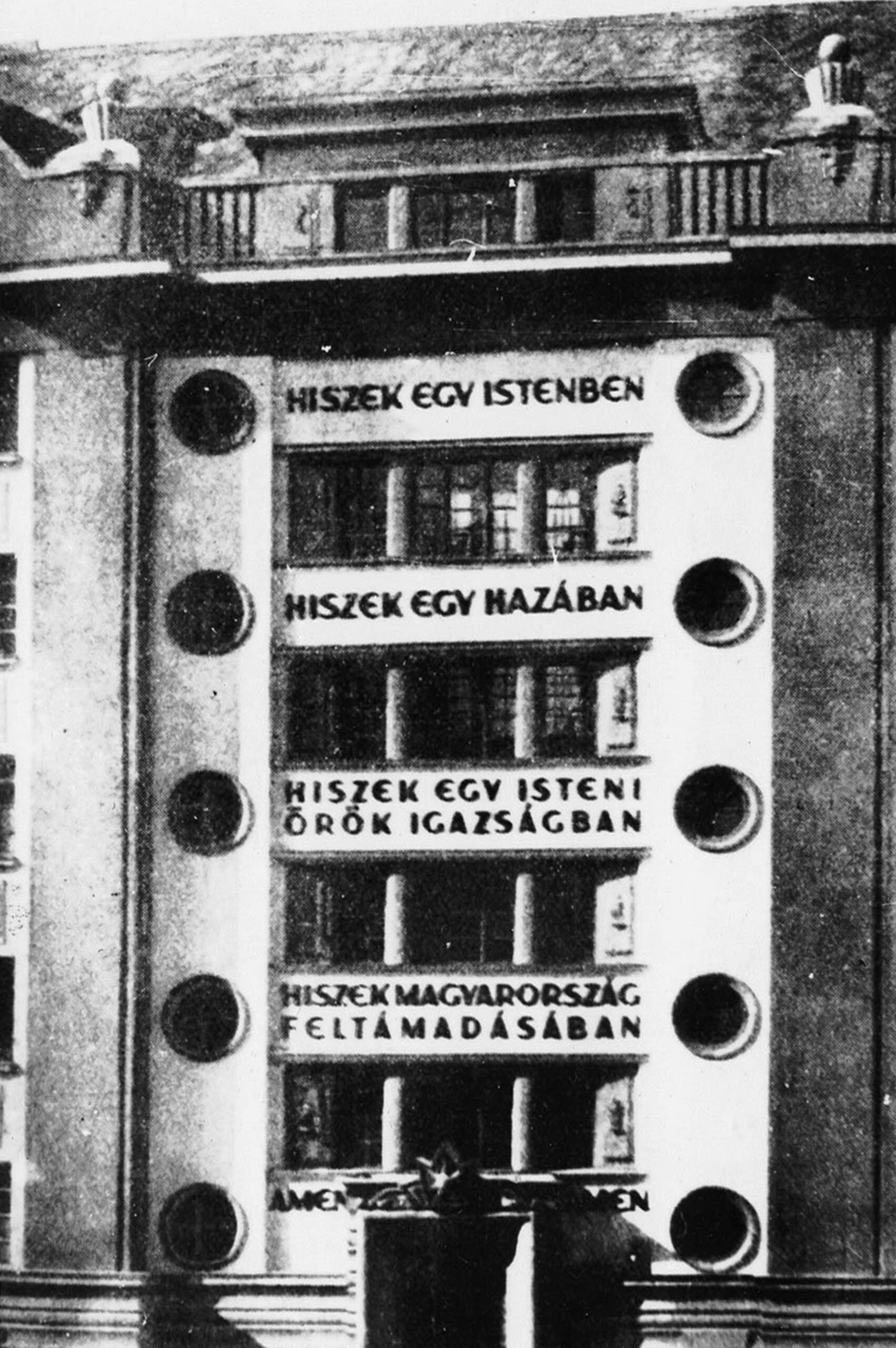 Budapesten még egy bérház bejárati homlokzatára is kikerült a háromsoros fohász. Ez a Gyöngyösi utca 4. alatt található art deco jellegű épület volt, melyet a zsidó származású, megbecsült építész, Freund Dezső (1884–1960) tervezett. A „Hiszekegy-