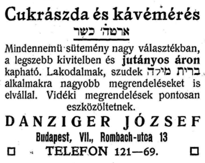 Különösen a nyári esküvők alkalmával lehetett népszerű választás Danziger József cukrászdája a Rumbach utca 13. szám alatt, ahol fagylaltot és jegeskávét is készítettek, sőt akár még vidékre is szállítottak.7 Danzinger vendéglője pedig még a főváros legvallásosabb híveinek is kiváló választás lehetett, hiszen a rituális felügyeletet az orthodox hitközség rabbinátusa látta el, csakúgy, mint Schlesinger Jakab kerthelyiséges vendéglőjében, a Kazinczy utca 51. alatt.8
