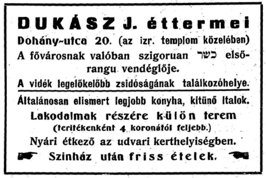 A neológ nagyzsinagógához való közelségével hirdette magát a Dohány utca 20. alatt a patinás Dukász étterem, mely a cégér szerint még 1842-ben Weingruber néven vágott a vendéglátó iparba.4 A Dukászban szintén külön terem, nyáron pedig kerthelyiség is várta az ünneplőket.5