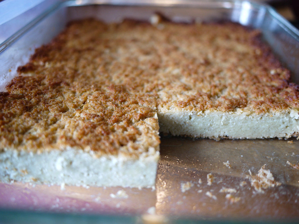 A krumplit meghámozzuk és finomra reszeljük. A hagymát szintén lereszeljük vagy nagyon apróra felvágjuk. A zöldségeket nagy tálba tesszük. A tojásokat egyenként üvegpohárba ütjük, ha meggyőződtünk arról, hogy nincs bennük vércsepp, akkor a reszelt krumplihoz adjuk őket. Sózzuk, borsozzuk, hozzáadjuk a lisztet és az olajat is. Alaposan összekeverjük. Kiolajozott tálba simítjuk, és 180 fokra előmelegített sütőben egy órán át sütjük.