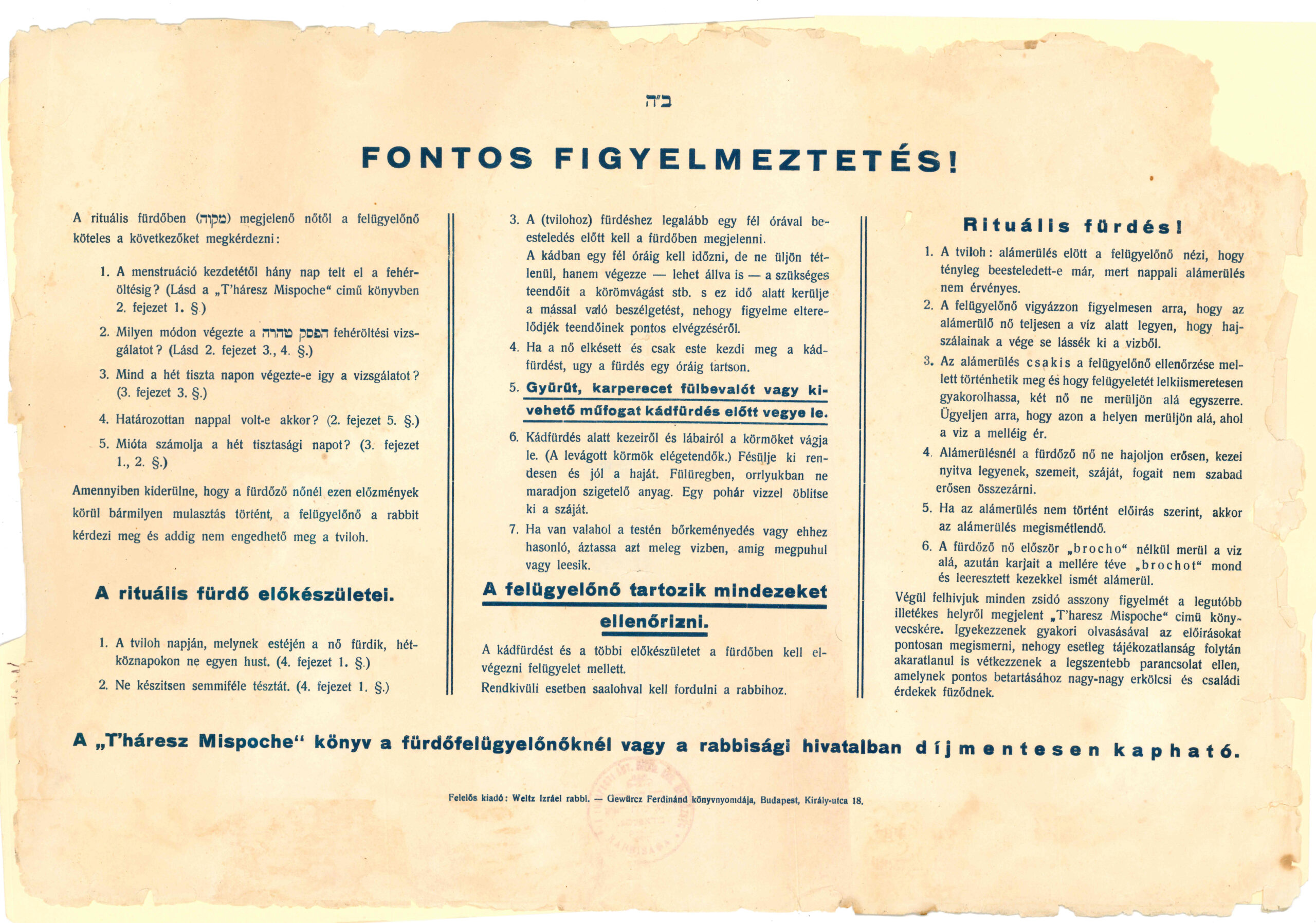 Ma, az alább említett napon összegyűlt és tanácskozott a város hét vezetője12, hogy elmélyedni egy közösségi ügyben13, és megvizsgálni egy micvá (parancsolat) ügyét, nagy javítást tenni. A mikvével (rituális fürdővel) kapcsolatban, miután sok panasz érkezett, amelyek szerint az asszonyok panaszkodnak, hogy a fürdőházban (bét hátvilá) a szolgálóasszonyok, vagyis Jichák úr, a kántor (cházán)14 felesége és L[éb], a templomszolga (sámesz)15 felesége nem teljesítik megfelelő módon kötelességüket16, ahogy a korábbi17 szolgálóasszonyok, és ráadásul… túl nagy díjat rónak ki, és ezáltal – sok bűnük miatt18 – sokan vétkeztek19, mivel [a magas díjak miatt] az asszonyok nem mentek a tisztulási megmerítkezésre20, ami nagy gond. Ennél még rosszabb21, hogy egy nem zsidó nő van, mint szolgáló a fürdőházban, ami idegen dolog, ilyenről nem hallottunk, és ilyenről őseink nem beszéltek nekünk, ilyesmit nem lehet tenni. Ezért döntöttünk úgy, hogy a rituális fürdőből származó bevételt22 árverés tárgyává tesszük, és így történt, hogy árverés tárgyává tétetett, a következő feltételekkel, hogy tudniillik: