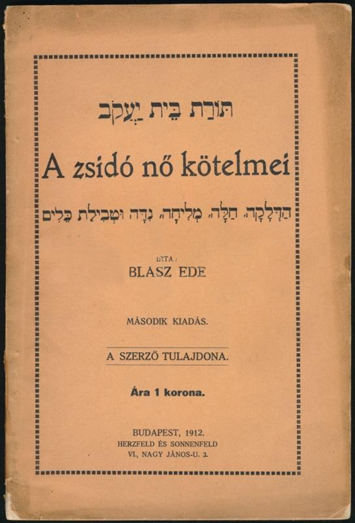 Az előszóban többek között szerepel: „Elkerülhetetlenül szükségesnek tartottuk tehát ezen a csornai Machaziké Hádász valláserősítő egylet rabbinus bizottságának tagjai által szerkesztett művecskét utánnyomatni. Ez a legszükségesebb törvényeket tartalmazza, s ajánljuk azon zsidó nőknek, akik erre súlyt helyeznek, tanulmányozzák át gondosan és türelemmel, hogy vele tisztában legyenek és teljesen sajátukká tegyék.”