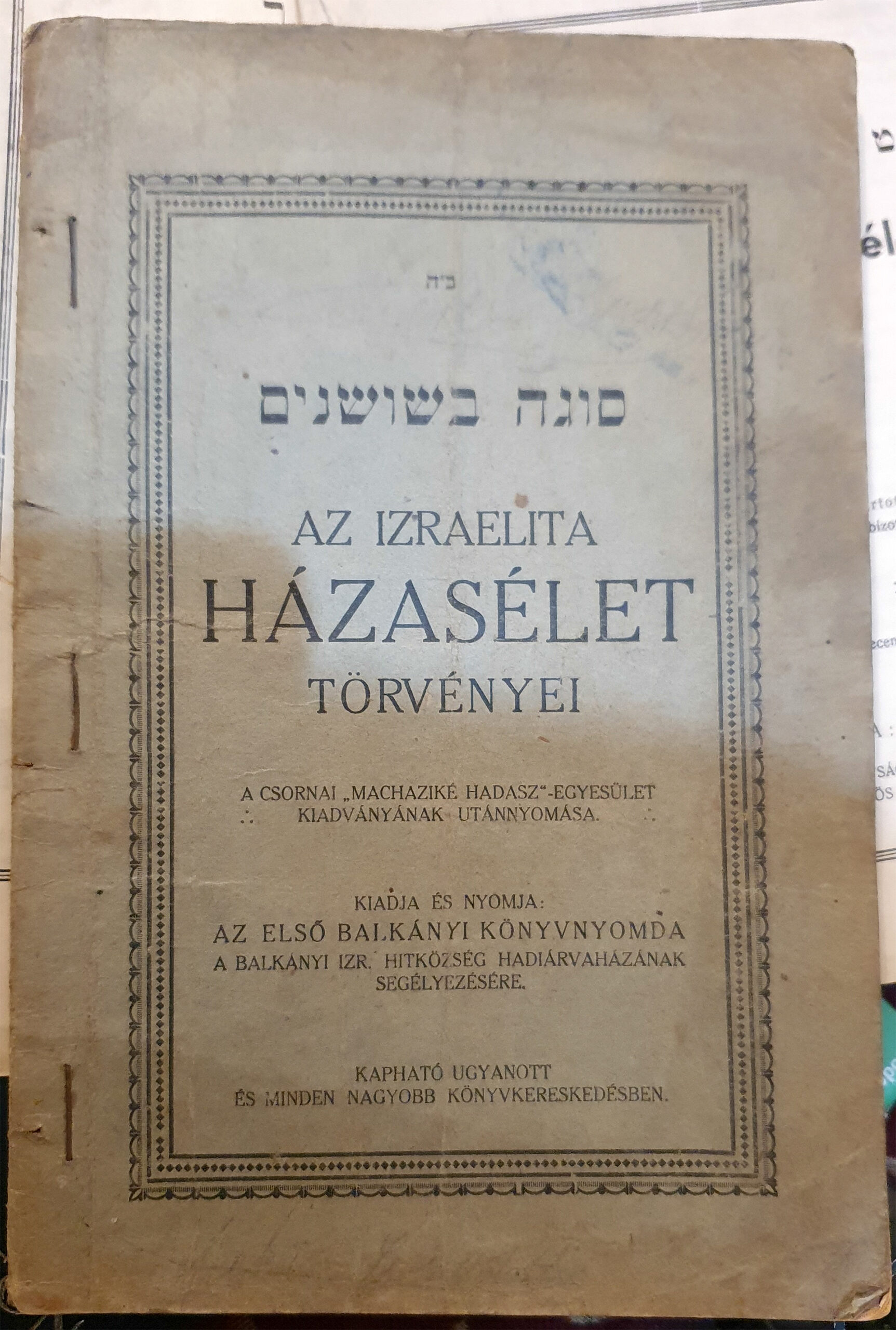 Blasz könyvének újabb kiadásaival párhuzamosan a csornai Machaziké Hádász Egyesület 1920-ban végül megjelentette a kiadványát Budapesten, םינשושב הגוס [Liliomokkal szegélyezve]10– Az izraelita házasélet törvényei címmel. Héber nyelvű címlapján szerepel: „Szerző: A csornai Machaziké Hádász Egyesület rabbinikus bizottságának tagjaitól”. Ennek én csak a héber címlapját láttam11, köszönettel tartozom Pataki Máriának, aki betekintést engedett a második, 1923-as kiadás birtokában lévő példányába. Ez „A csornai Machazike Hádász Egyesület kiadványának utánnyomása. Nyomtatott és kiadja: a Balkányi Izr. Hitközség által fenntartott hadiárvaházban elhelyezett hadiárvák felsegélyezése javára az Első Balkányi Könyvnyomda Vállalat.” (Szokatlan, hogy Izraelita hitközségnek nevezik magukat, a szokott Orthodox hitközség megjelölés helyett.)