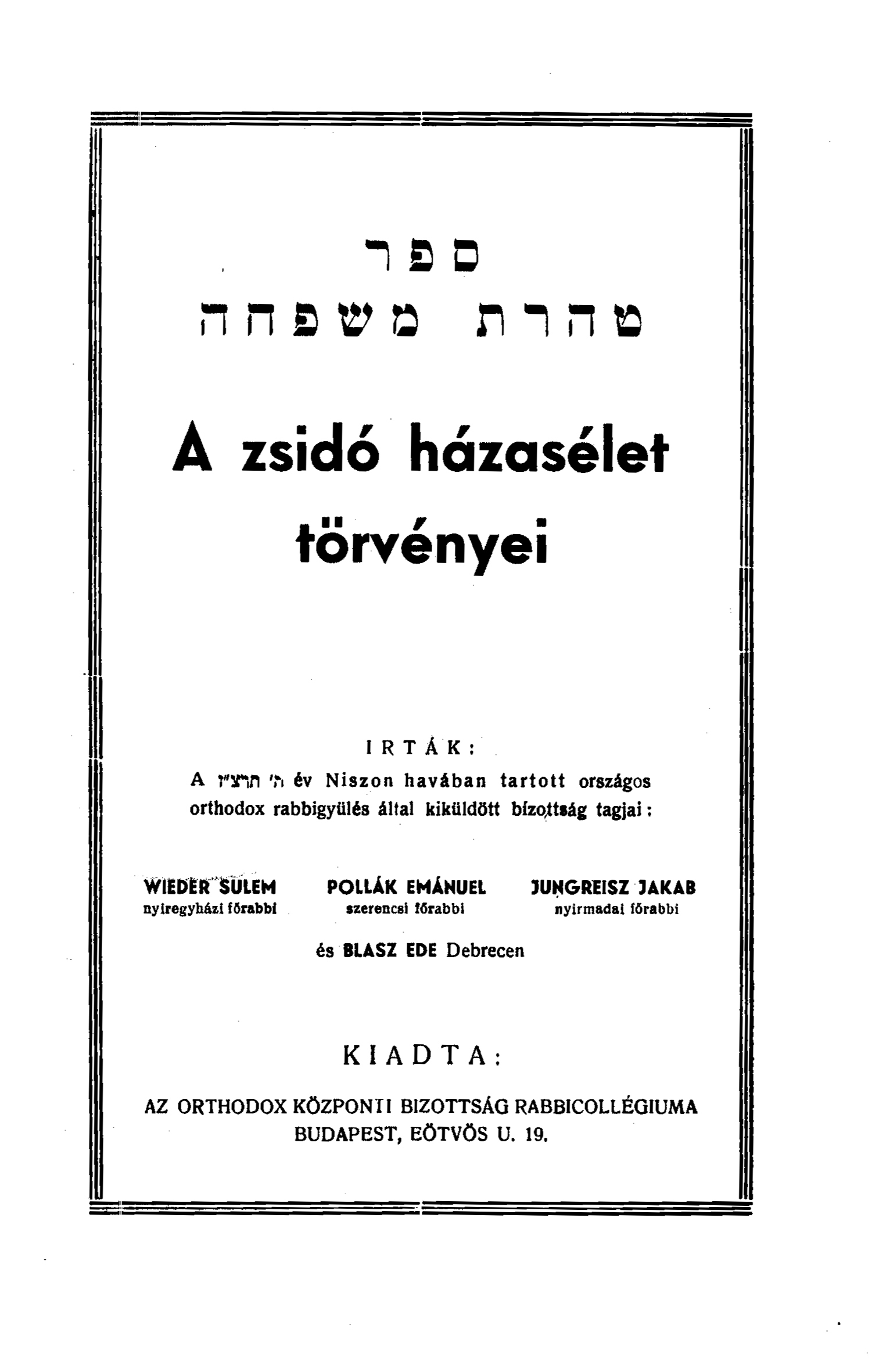 A fenti kiadványok helyi kezdeményezések hatására jöttek létre, ilyen témájú magyar nyelvű hivatalos kiadványa a Magyar Ortodox Rabbinátusnak csak jóval később jelent meg végül. A kiadvány címlapján szerepel: „רפס החפשמ תרהט [A családi tisztaság könyve] – A zsidó házasélet törvényei– Írták: A ז׳׳צרת [5697.] év Niszon13 havában tartott országos orthodox rabbigyűlés által kiküldött bizottság tagjai: Wieder Sulem [1868–1944] nyíregyházi főrabbi, Pollák Emánuel [Menáchem, 1891–1952] szerencsi főrabbi, Jungreisz Jakab [Jáákov Joszéf, ?–1944] nyírmadai főrabbi és Blasz Ede Debrecen. Kiadta: az Orthodox Központi Bizottság Rabbikollégiuma, Budapest”. A címben említett gyűlés 1937. március 8–10. között zajlott, és bár a Zsidó újságban14 több terjedelmes beszámoló is megjelent az ott elhangzottakról, arról, hogy eldöntötték egy ilyen kiadvány megjelentetését, nem esik bennük szó. A beszámolóból egyébként az is kiderül, hogy Blasz Ede az Országos Képviselőség világi (vagyis nem rabbinikus)15 vezetőségi tagja volt, aki „az elnöki üdvözlésre nagy hatású beszédben válaszolt…”, amit „zajos ovációval fogadott” a közönség.