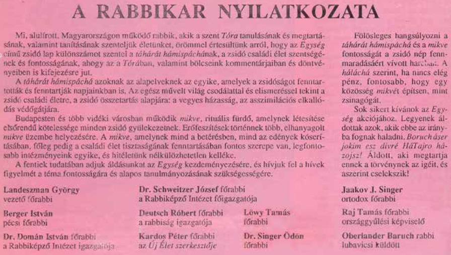 Az Egység 11. számának (1992. december) a táhárát hámispáchá, a családi élet tisztasága volt a témája. Különlegesen fontosnak tartottam, hogy minél szélesebb körben meg tudjuk szólítani a zsidó házaspárokat, hogy szenteljenek figyelmet ennek a fontos témának, és hogy a hölgyek járjanak el a mikvébe. Célkitűzésemhez elnyertem számos magyar ortodox és neológ rabbi támogatását, akikkel közös nyilatkozatot tettünk közzé az újságban.