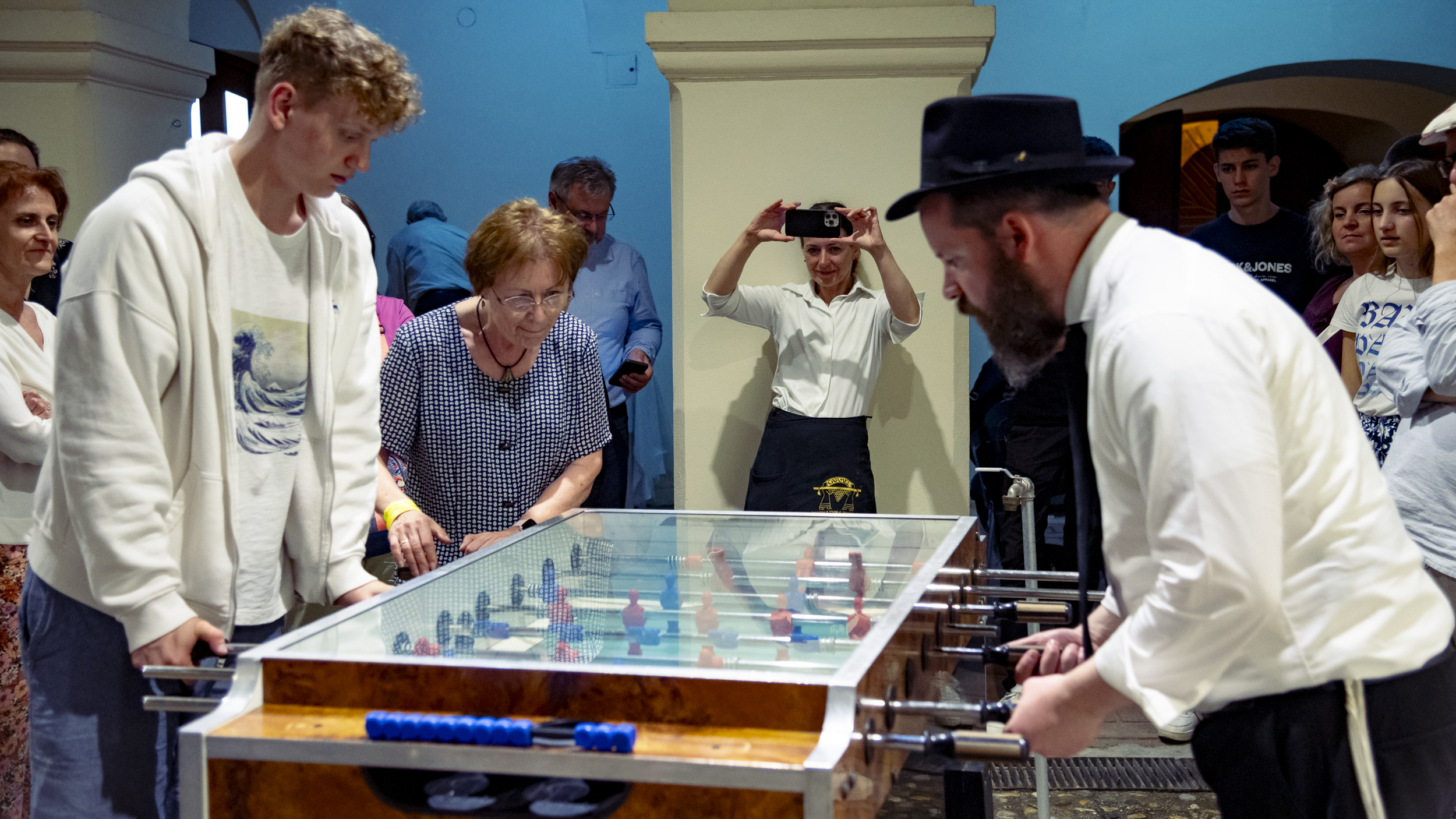 De hogy került egyáltalán a csocsóasztal a Budavári zsinagóga udvarára és miért fordult meg itt este 10 és hajnali 2 között vagy száz ember? Azért, mert szombat éjjel nemcsak a focikapuk voltak nyitva, hanem a zsinagógák is: imaházaink idén is csatlakoztak a Múzeumok Éjszakája rendezvénysorozathoz, aminek fő motívuma a foci Eb-hez kapcsolódva a Gólpassz volt.